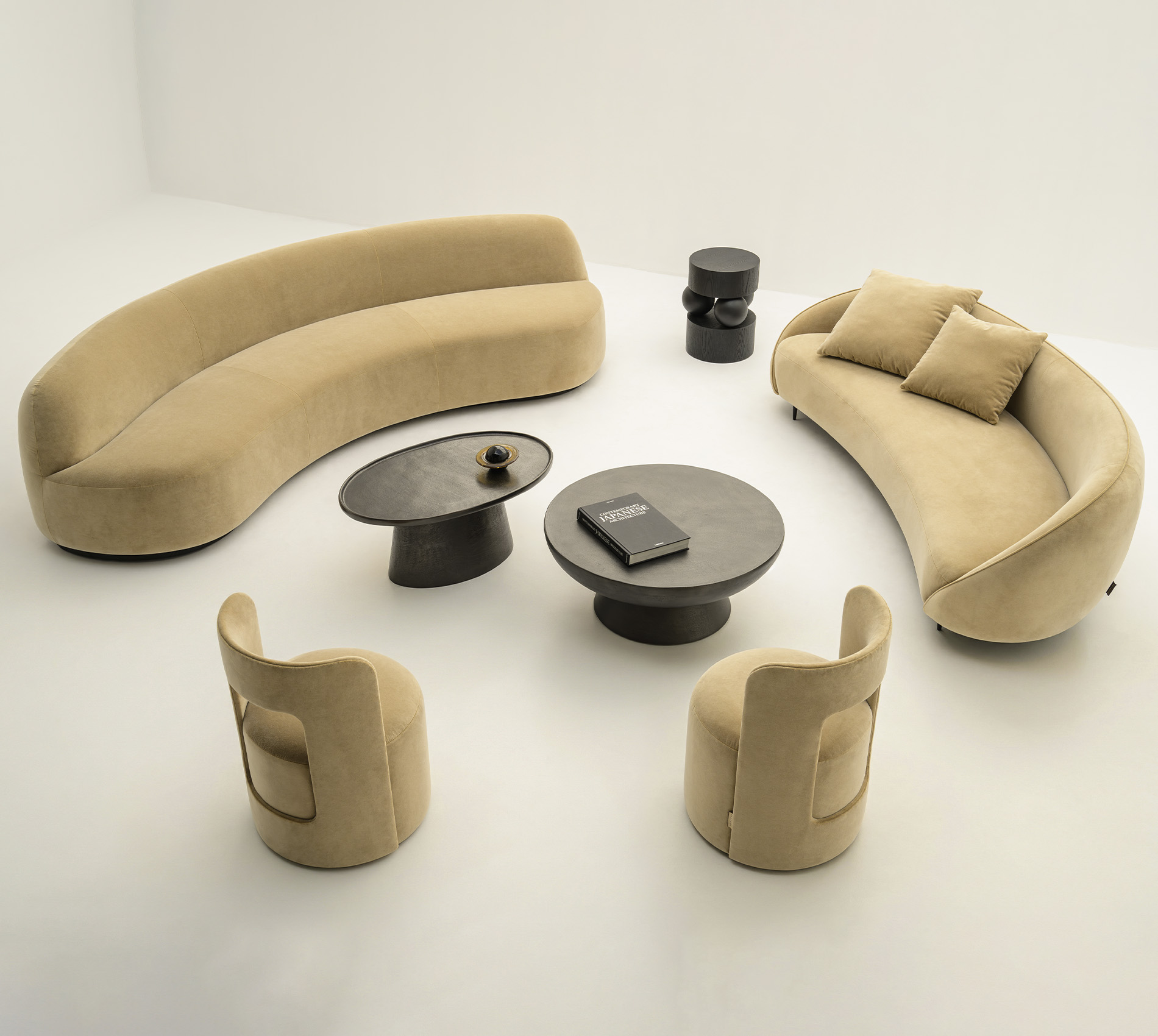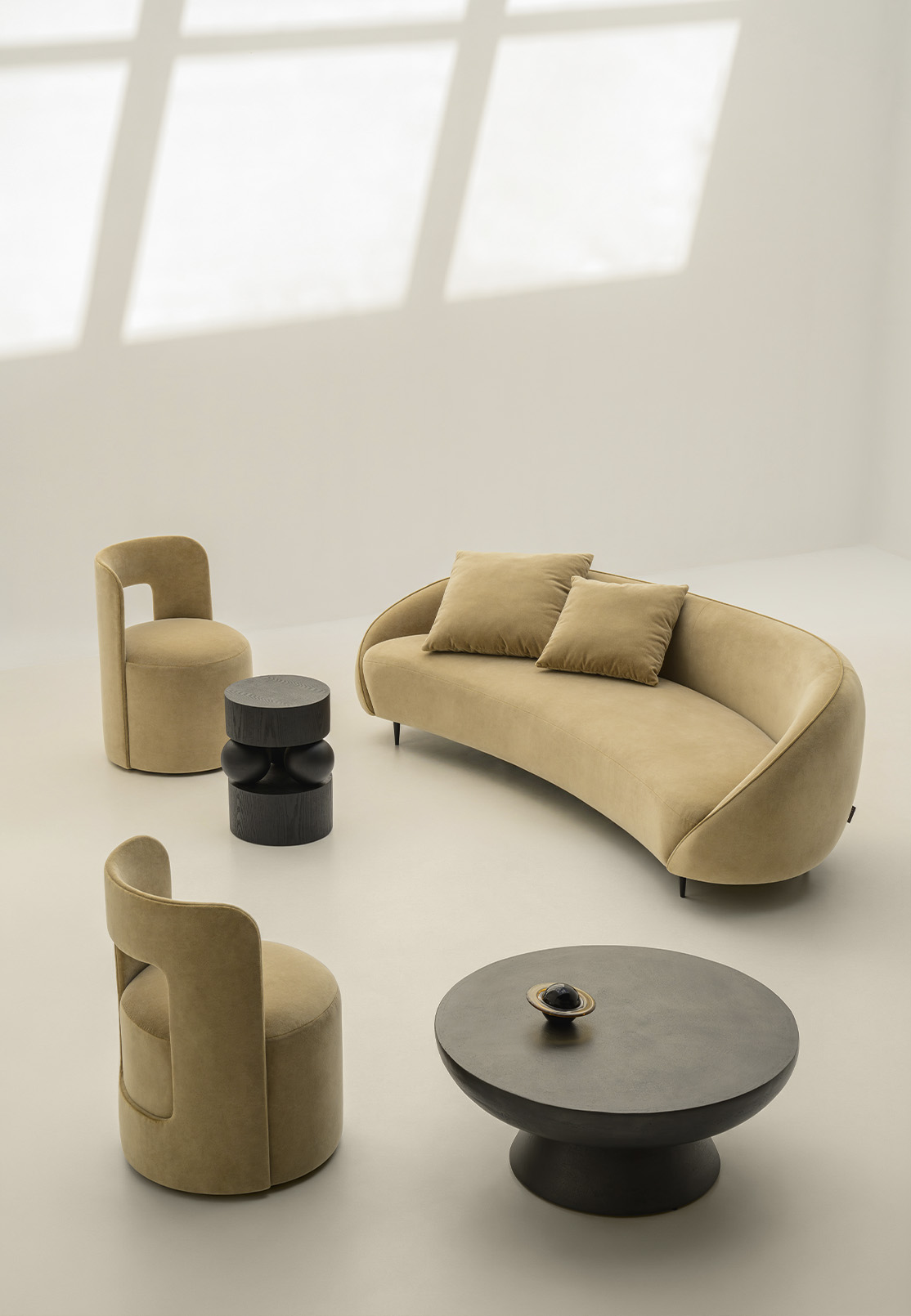 Two sofas anchor the edit, each making a different case for the same idea of ease. The Sandy Sofa curves inward and embraces. Its generous arc folding around whoever sits within it, committed and almost architectural in its confidence.