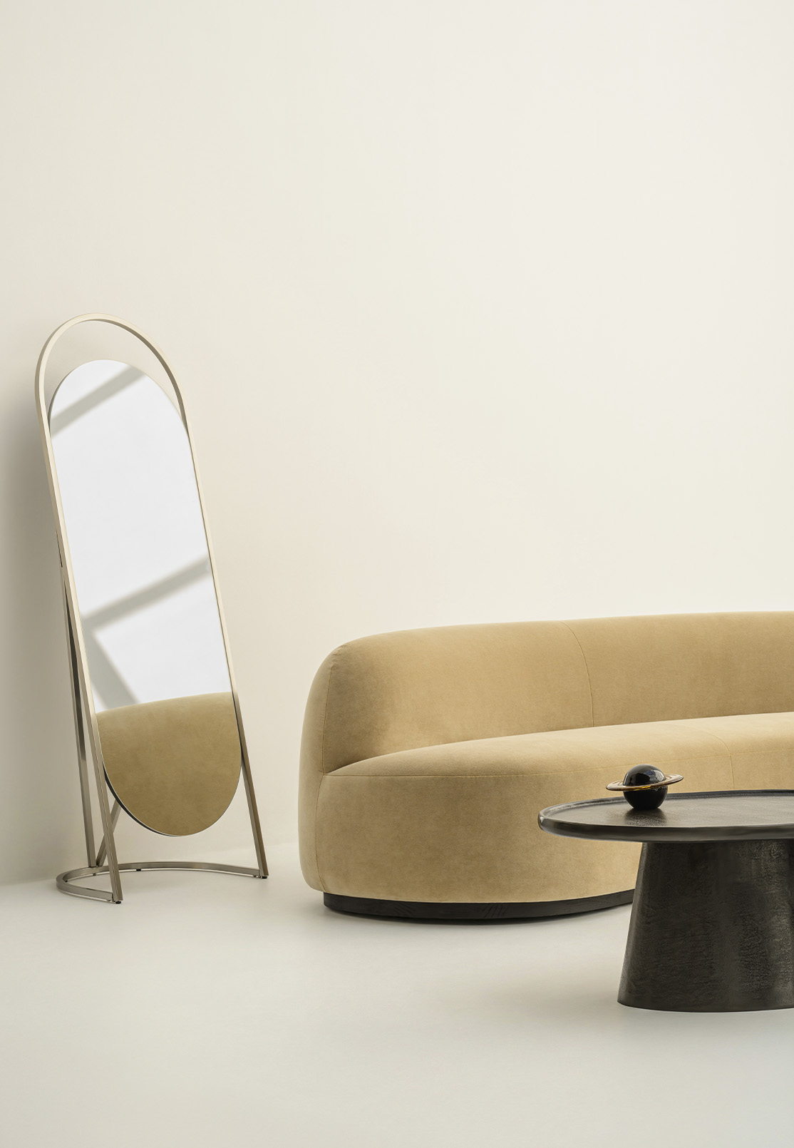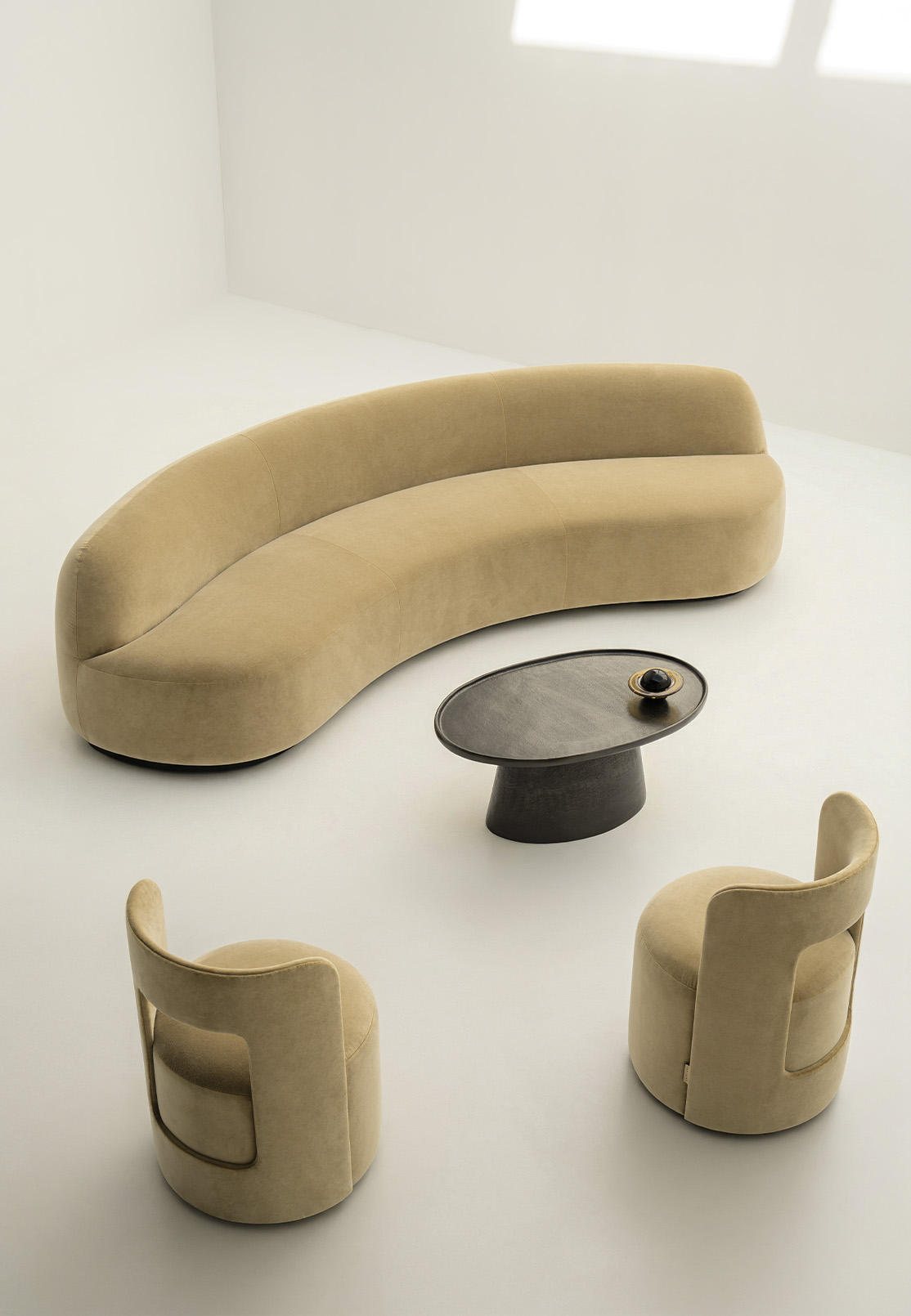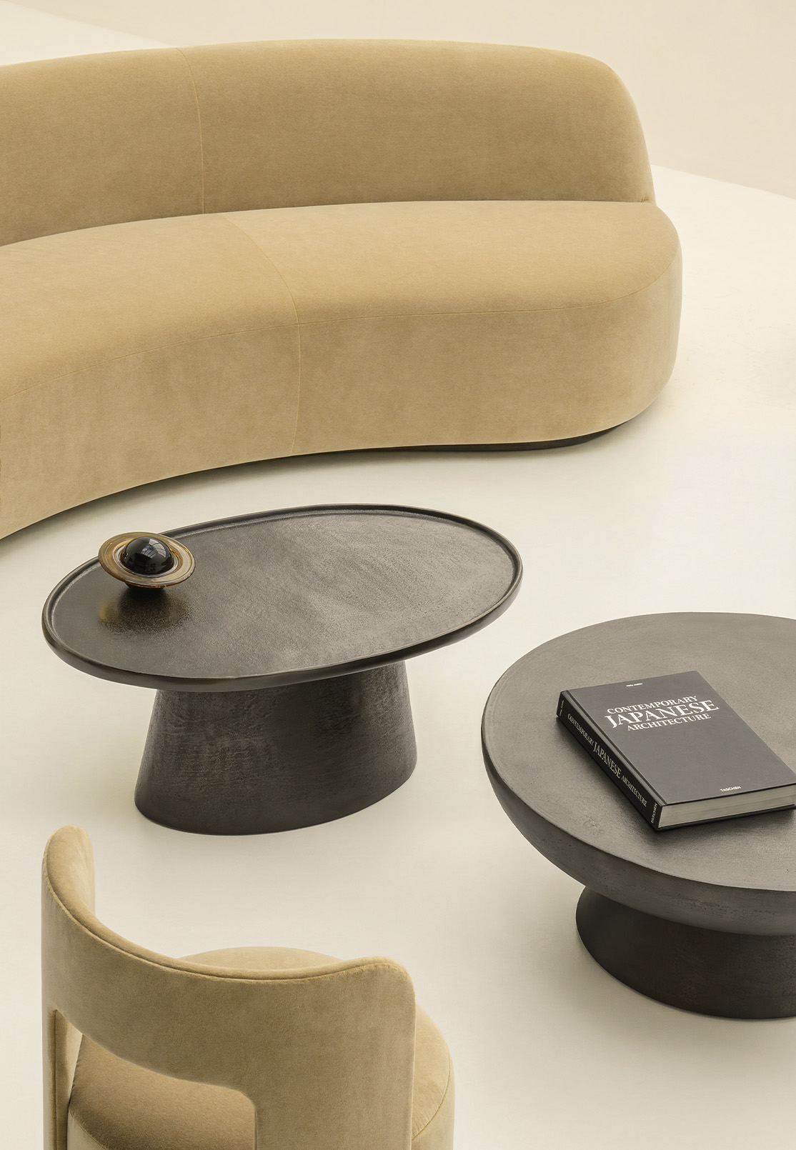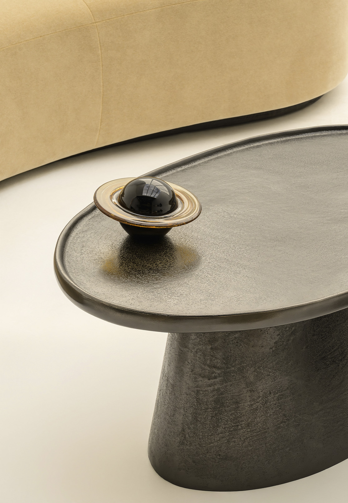Against all this warmth, the Coupe Coffee Table insists on something else entirely. Cast aluminium, dark graphite, its wide shallow disc resting on a tapering base. There is a ceremonial gravity to it that has nothing to do with ceremony and everything to do with proportion. Without it, the room would simply be comfortable. With it, the room becomes a considered argument.