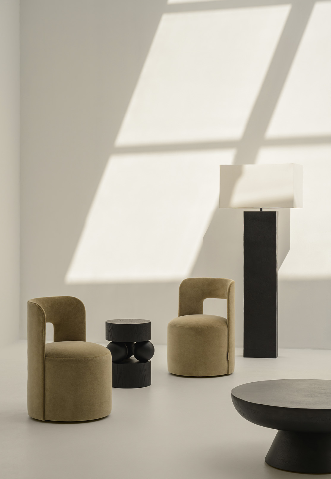 Paired with the Teo Wheeled Chair – compact, self-possessed, its backrest cut through with a clean rectangular aperture that lightens the whole piece with a note of considered wit – the seating arrangement becomes a conversation rather than a display. The Teo's scale is deliberately unimposing; it is the chair one draws forward when a gathering turns intimate.