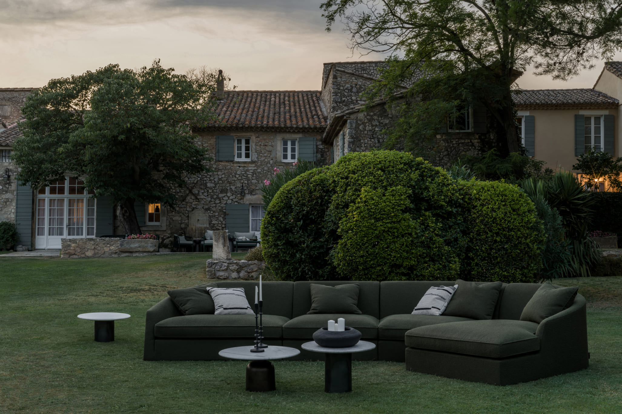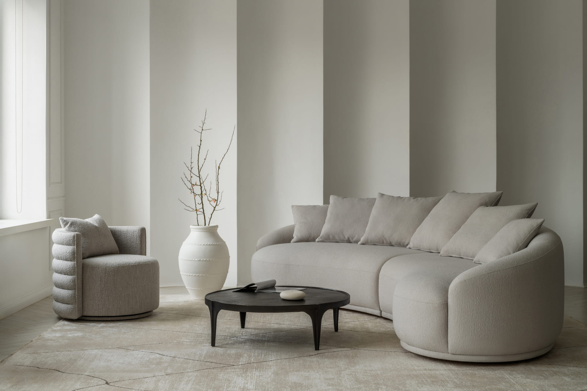 Its curved form feels more welcoming than traditional corner sofas, while the flexible configuration allows it to adapt to larger living areas. A central module makes it possible to arrange the sofa along a radius, softly zoning the space and defining the living area without rigid boundaries.