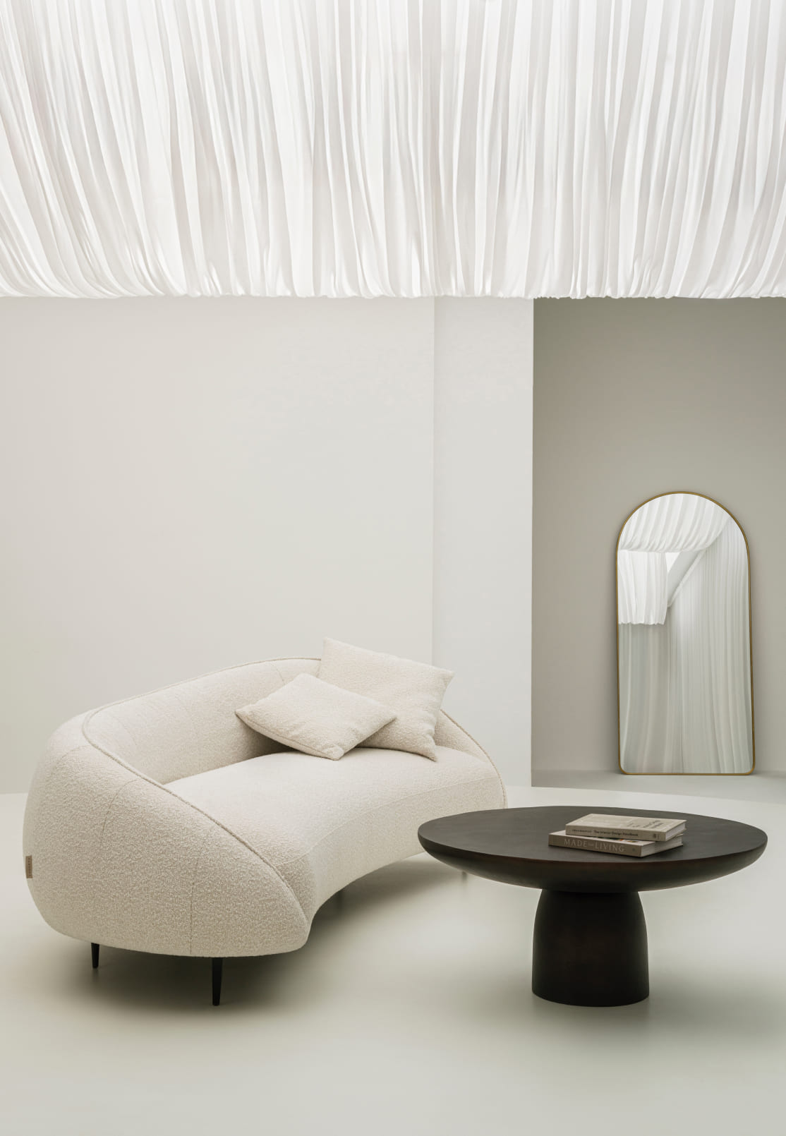 Stella is defined by its continuous curve — a silhouette that feels calm, balanced and quietly confident. The sofa’s low, flowing backrest follows the natural line of the seat, creating a soft enclosure without visual heaviness. Upholstered in tactile fabric, Stella brings a sense of stillness to the interior, where comfort is expressed through proportion, texture and restraint rather than excess. Its sculptural form allows the sofa to anchor a space while remaining visually light, making it equally suited to open-plan living rooms and more intimate settings.