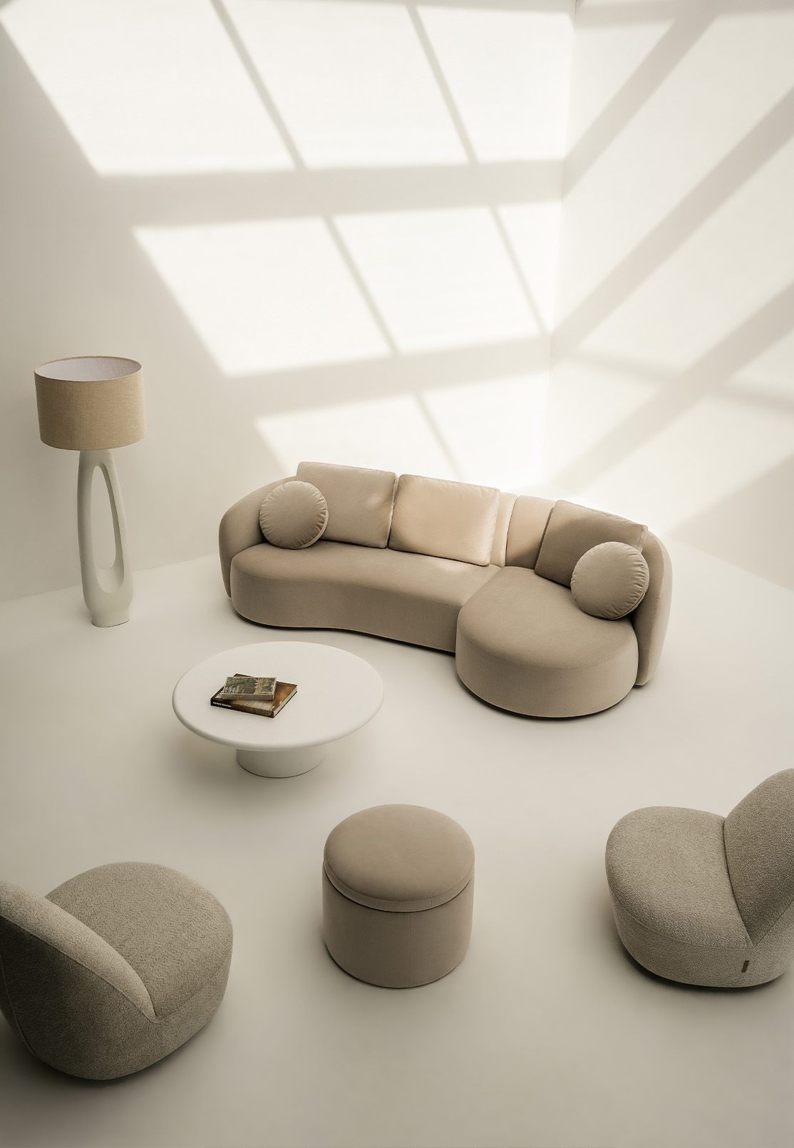 The same items appear in projects of very different sizes. The Sonora Sofa works in a compact Marina apartment and in the lobby of a boutique hotel. The Bridge Bedside Table shows up in studio bedrooms and in restaurant interiors. The Caspian seats three in a family living room and six in a waiting area. What these pieces share is a proportion that does not depend on the room around it: they hold their presence in a small space without overwhelming it, and they hold their own in a large one without disappearing.