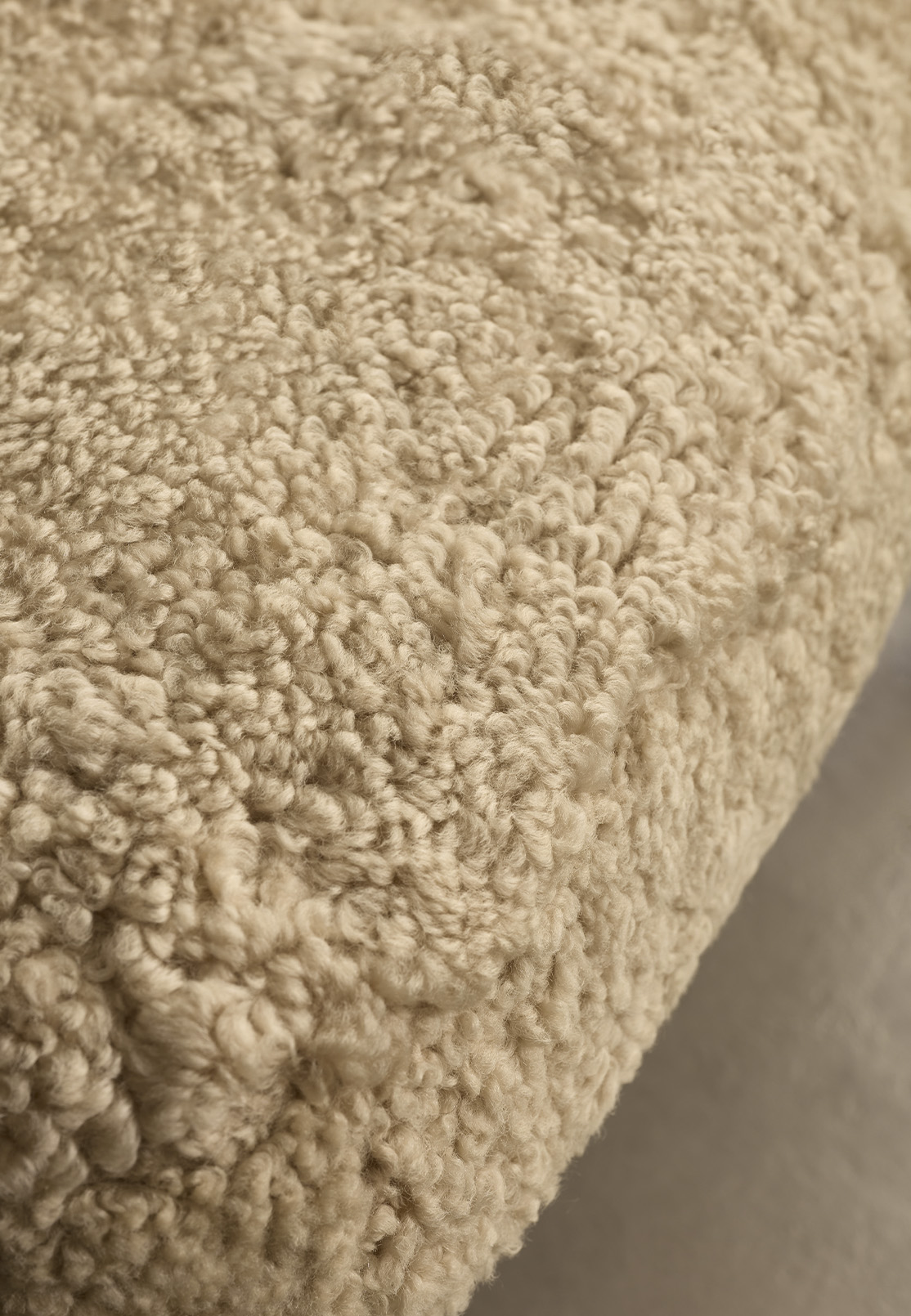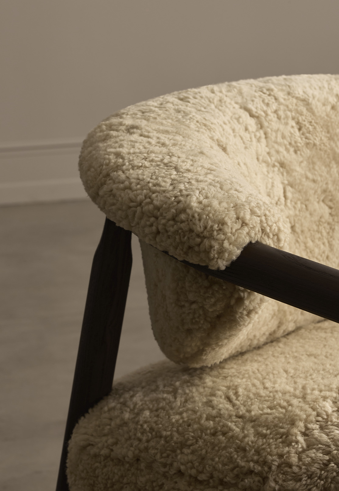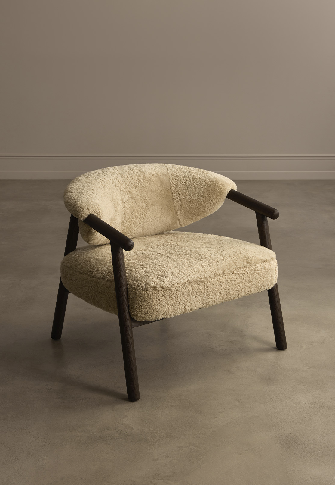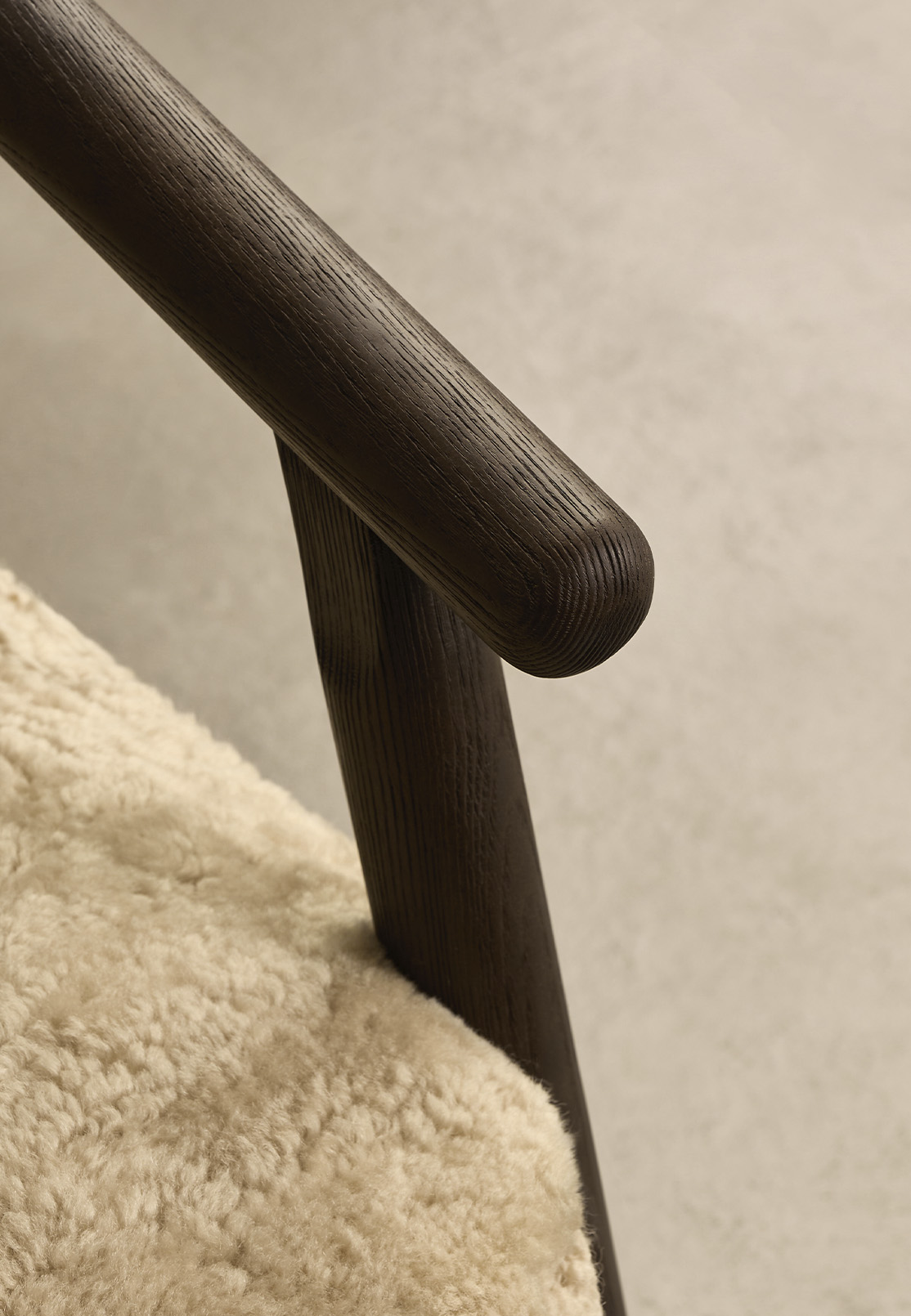 Nur combines a clear architectural frame with the tactile warmth of sheepskin upholstery. The angled ash structure gives the chair its graphic outline, while the generously padded seat and backrest introduce softness that visually softens the composition.