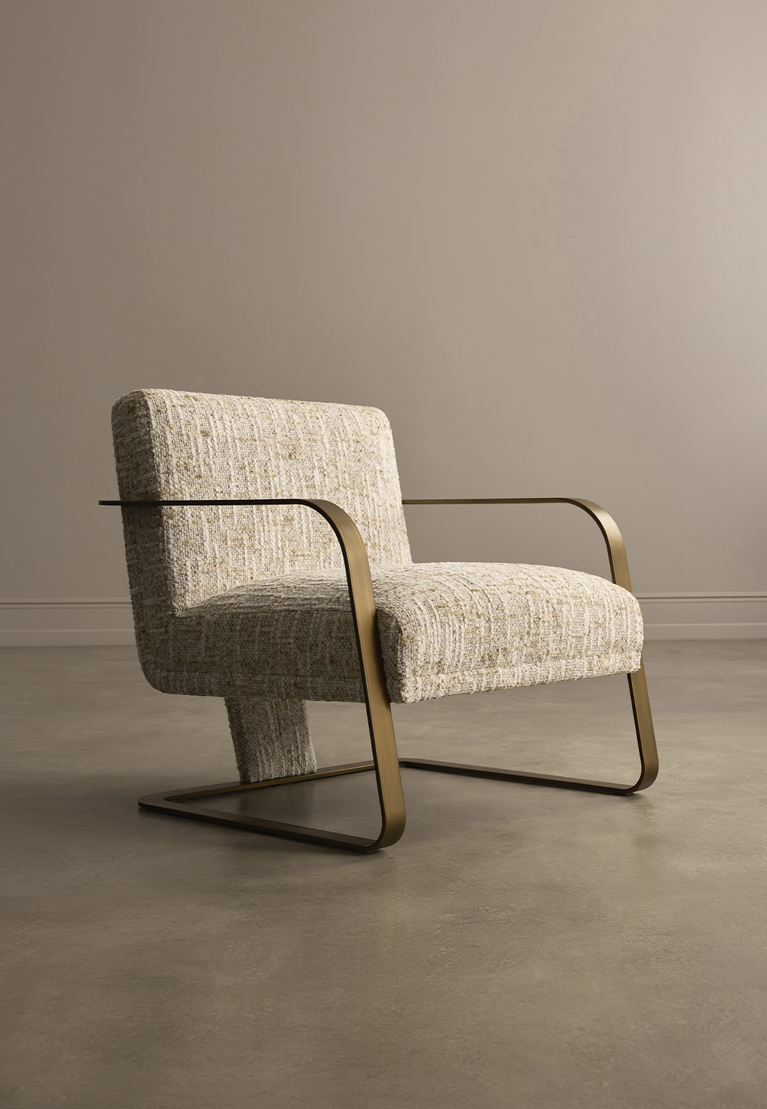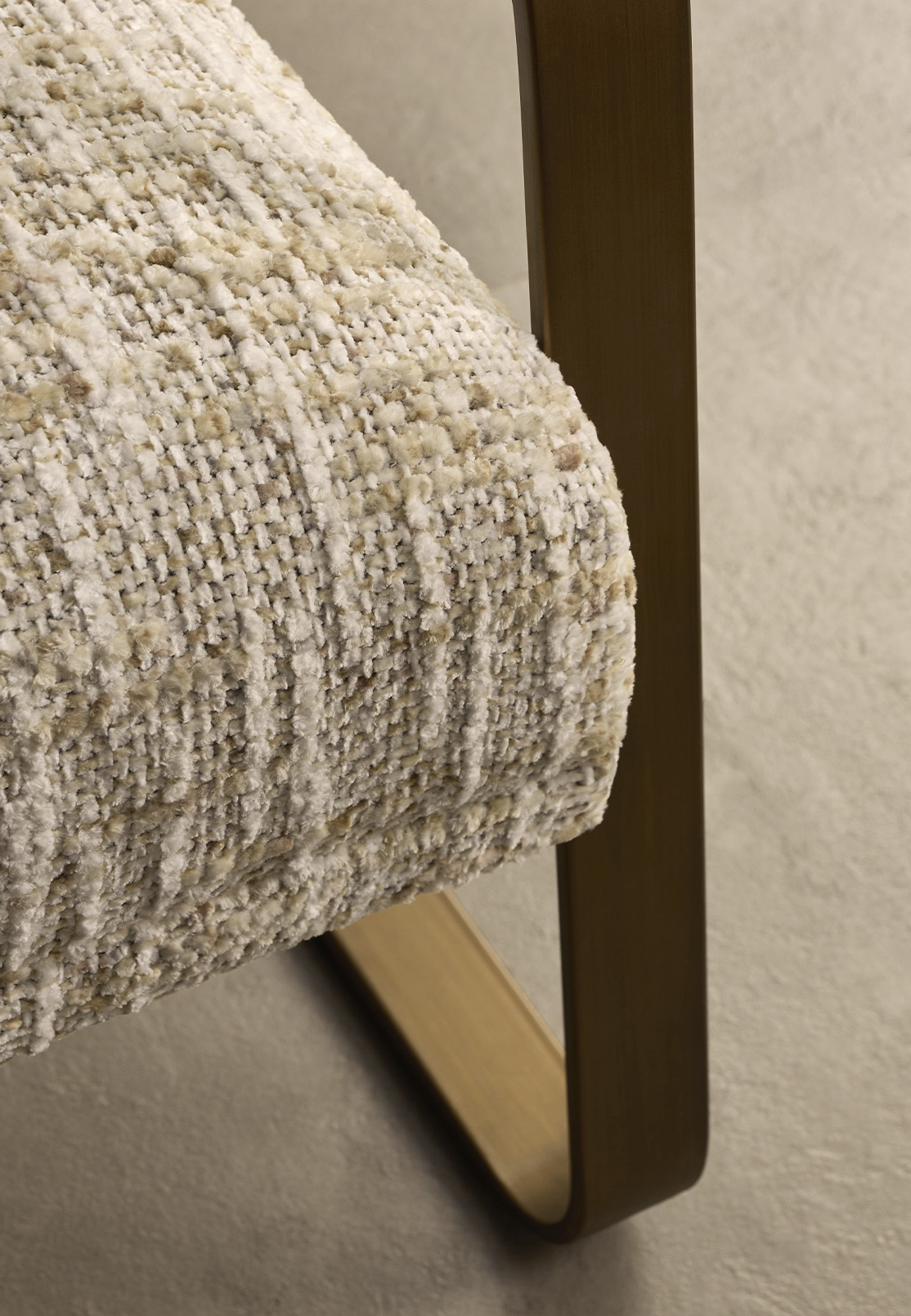 This slender metal line gives the chair a visual lightness, allowing the form to feel open rather than heavy. At the same time, the textured upholstery introduces warmth and tactility, softening the clarity of the frame.