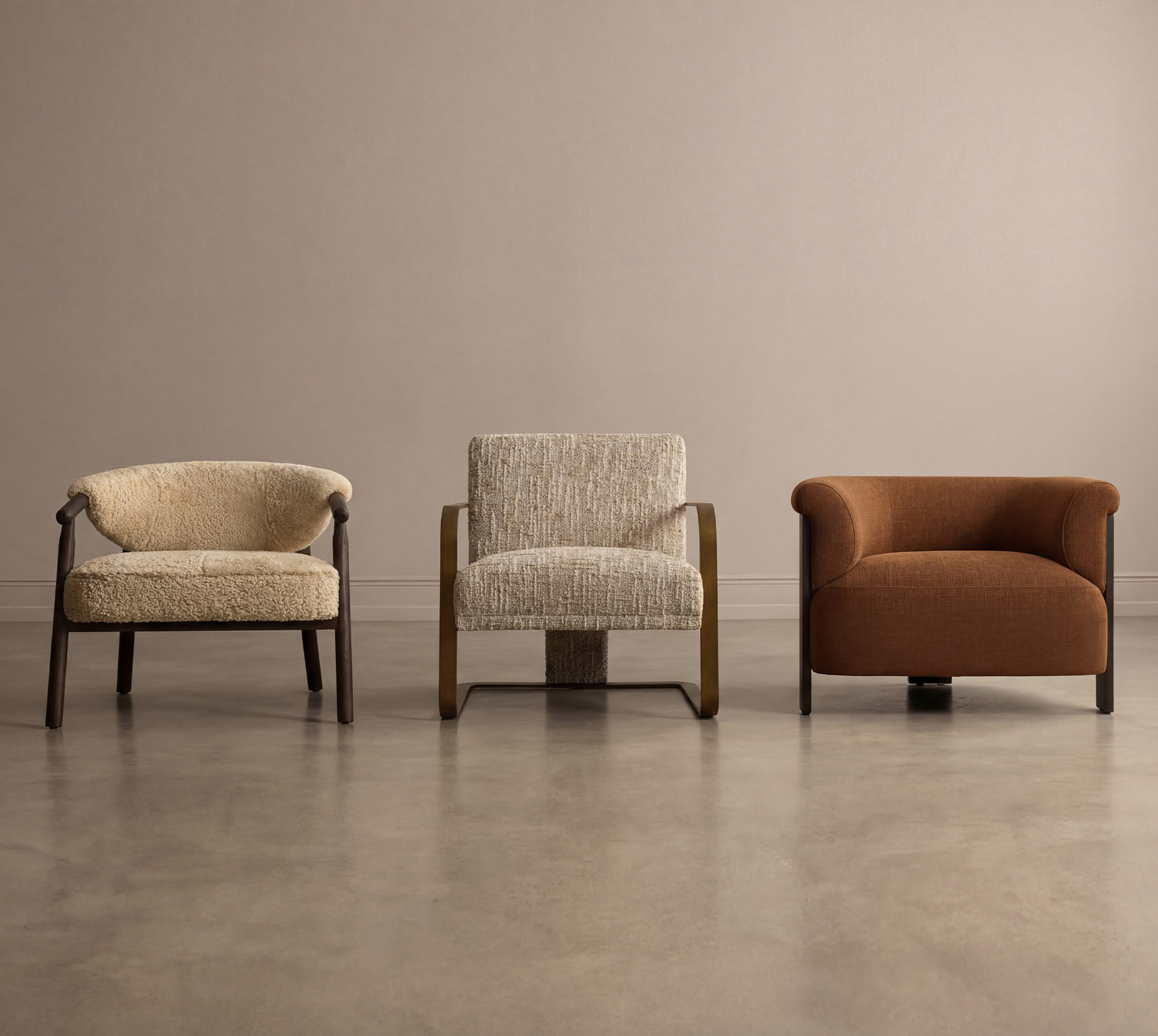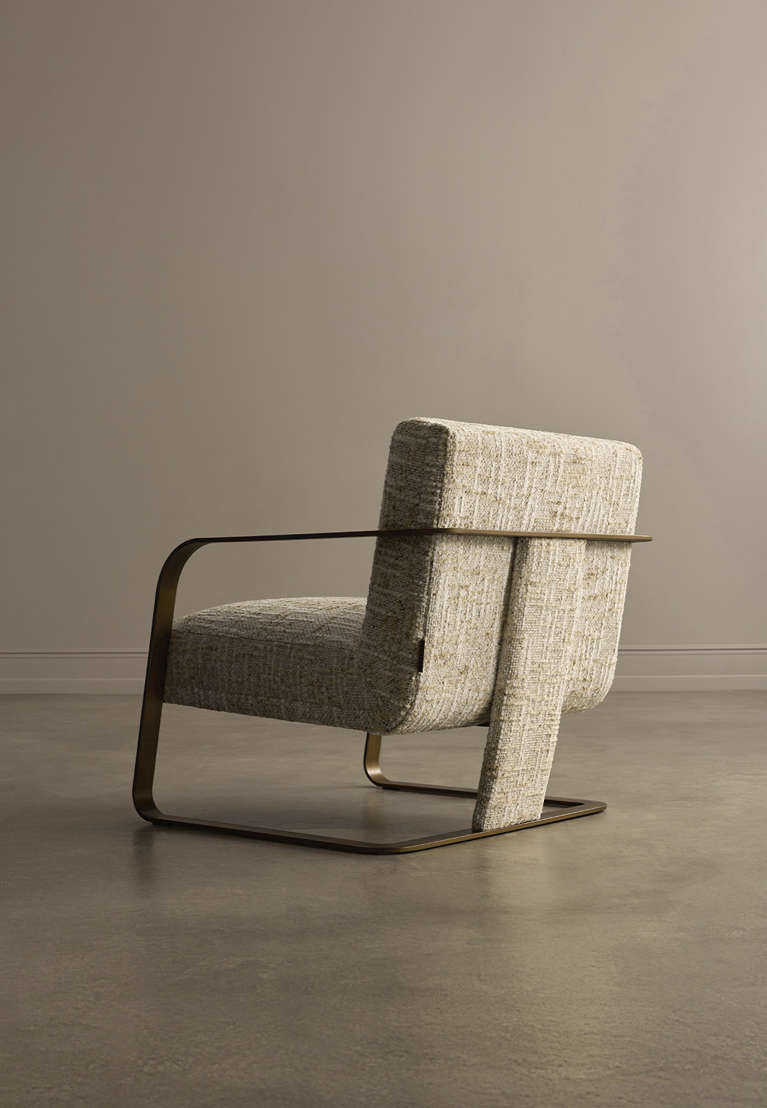 Rona explores comfort through a careful balance of structure and softness. Its upholstered body is held within a continuous metal frame that extends fluidly from the base into the armrests, creating a single architectural gesture.