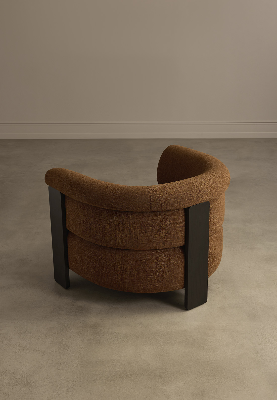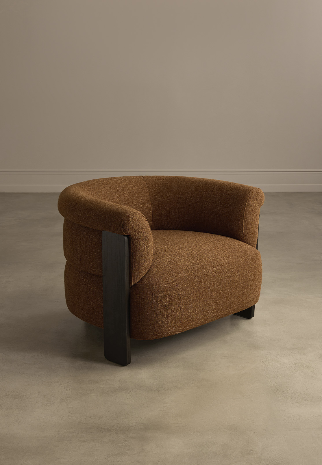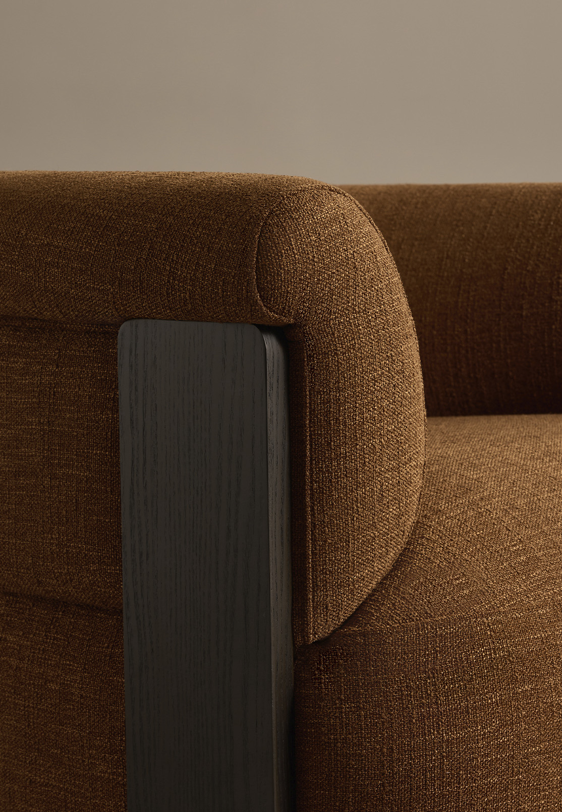 What makes Nur particularly compelling is the dialogue between materials. The dark wooden frame defines the silhouette, while the textured upholstery adds warmth and depth, allowing the chair to feel both structured and inviting at once.