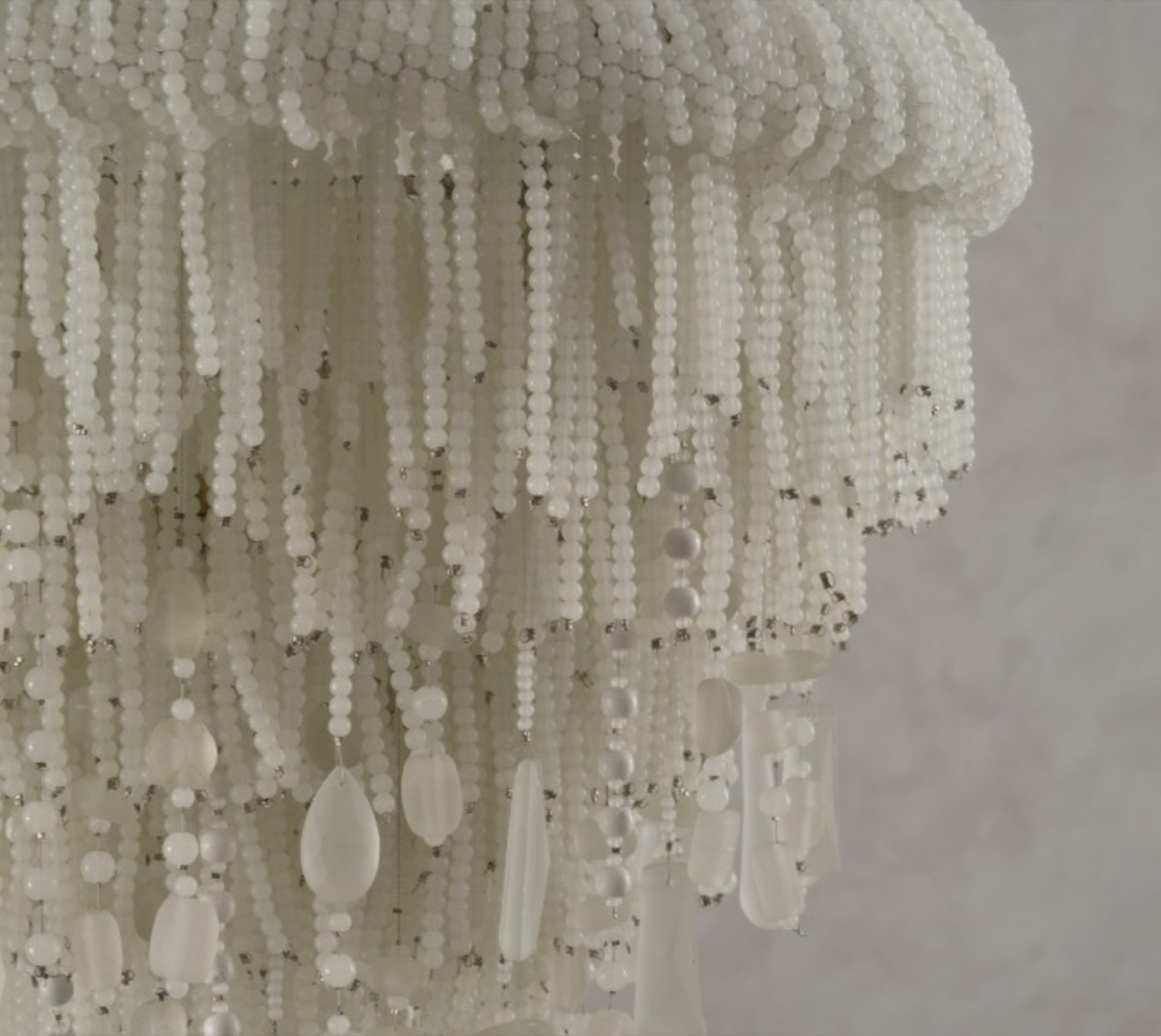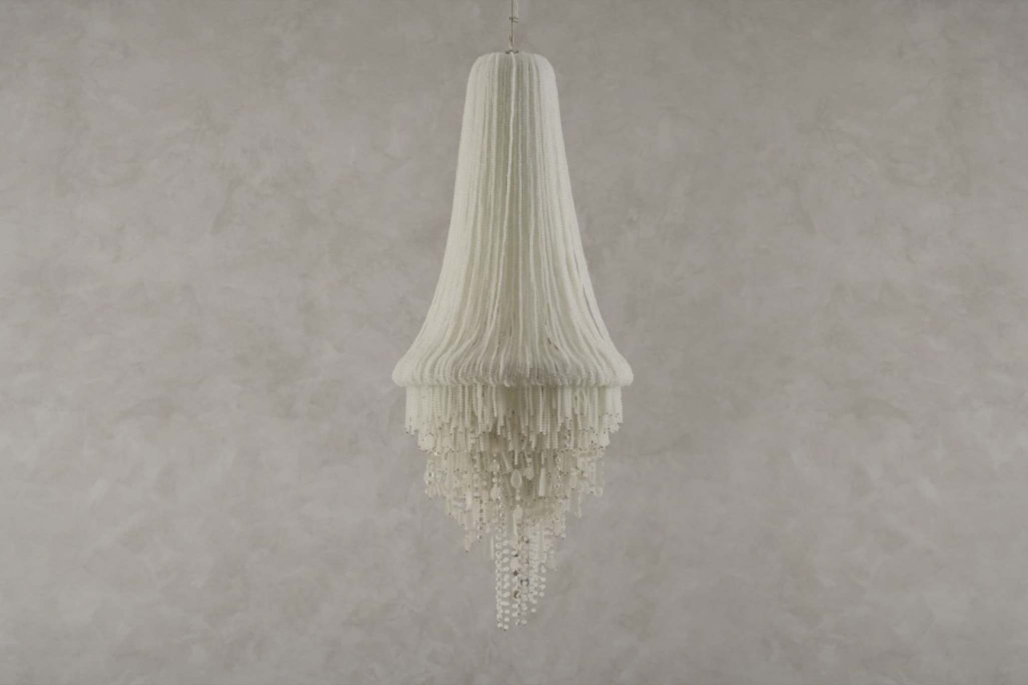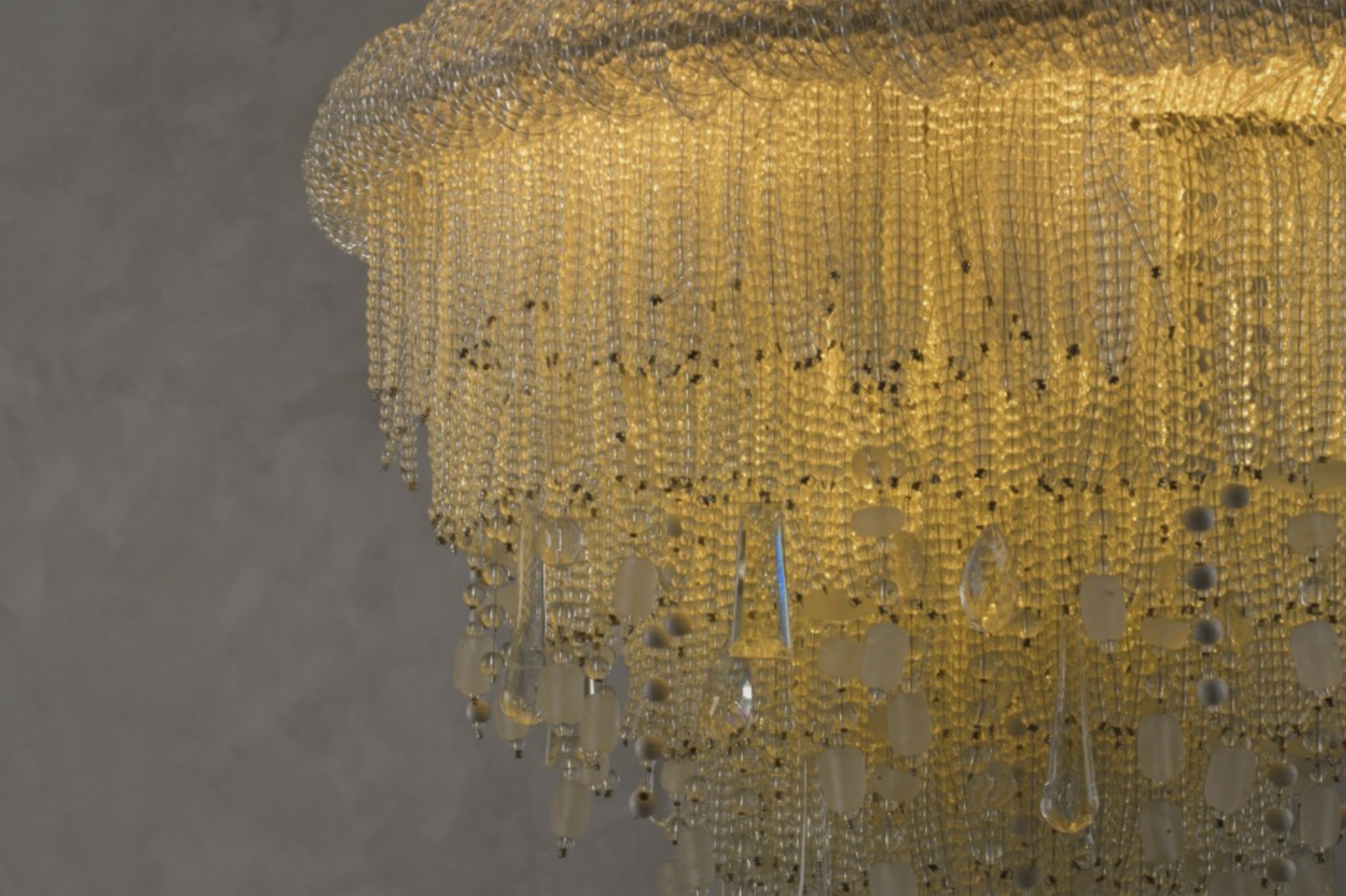 Bogemia is the statement-maker of the trio: vertical, sculptural, and unapologetically decorative. Its silhouette is built from layers of fine, translucent elements that fall like a soft fringe, catching light from every angle. The effect is both glamorous and tactile: it doesn’t just illuminate a room, it animates it.
