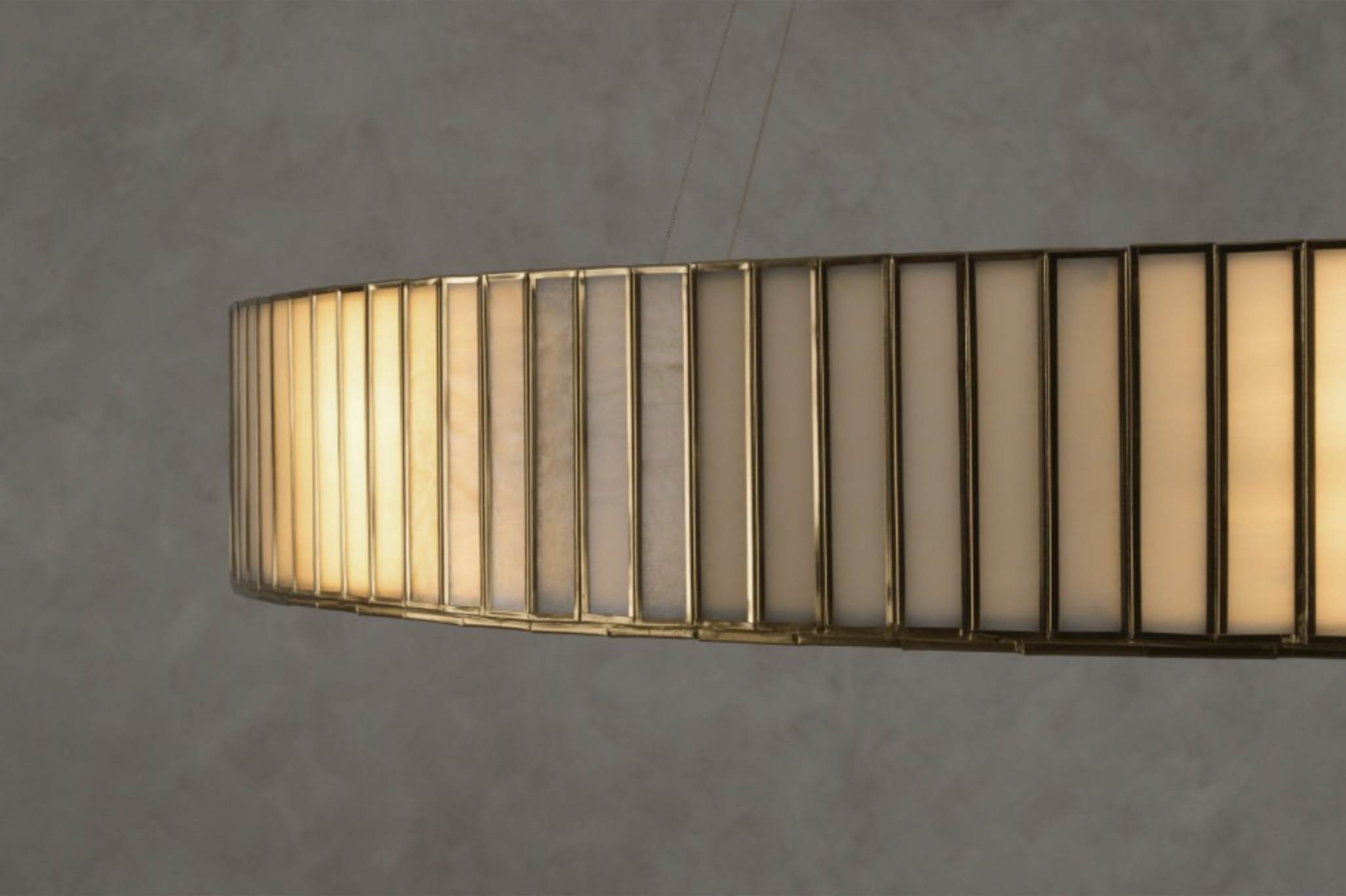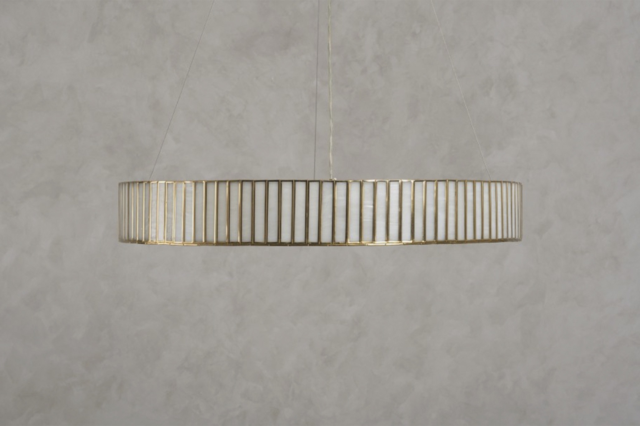 Aura is all about line, proportion, and glow. The design reads like a floating ring: a crisp metal frame with a rhythmic grid that gives the chandelier its graphic character, while diffused glass panels soften the light into an even, architectural wash.