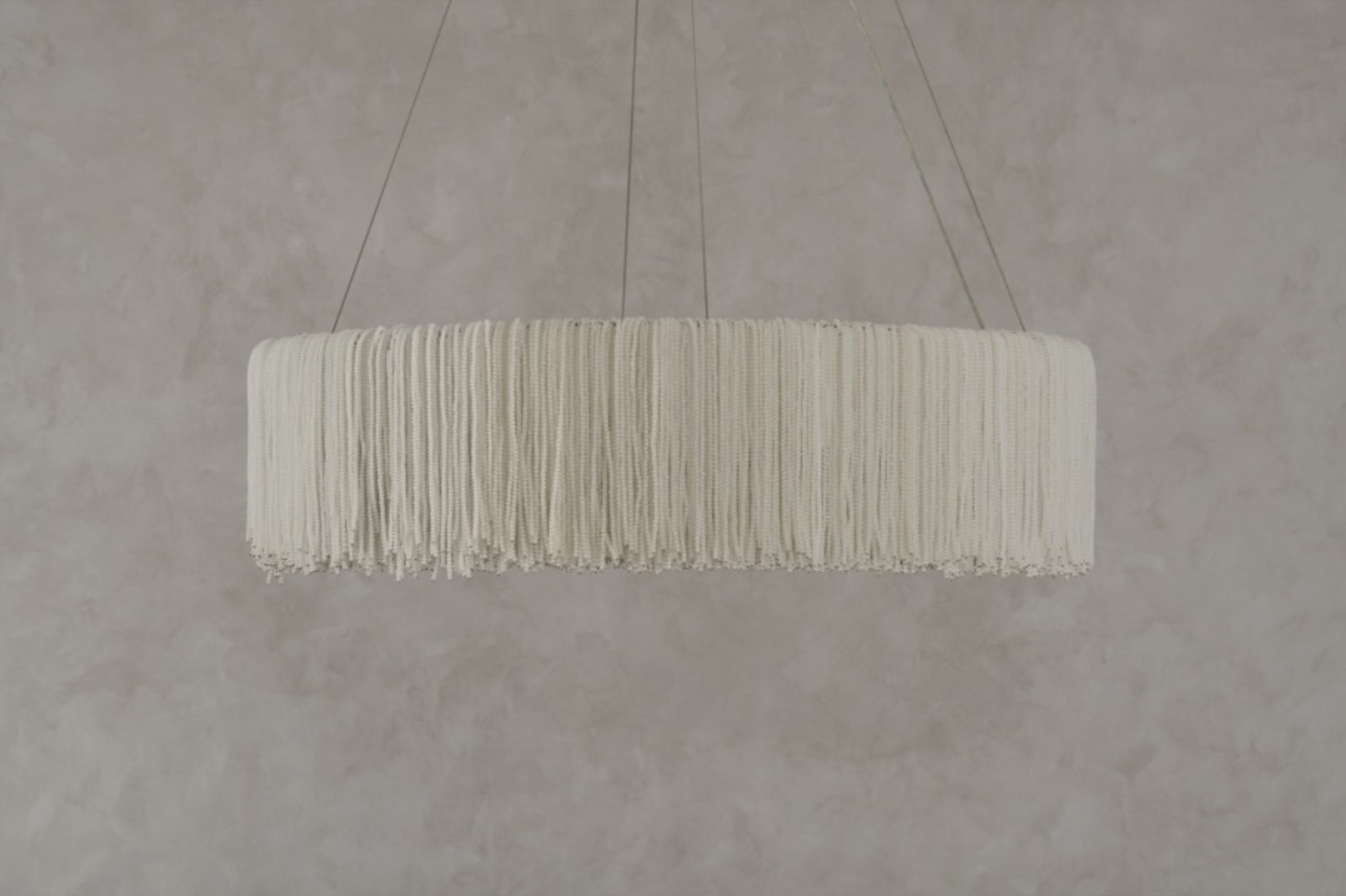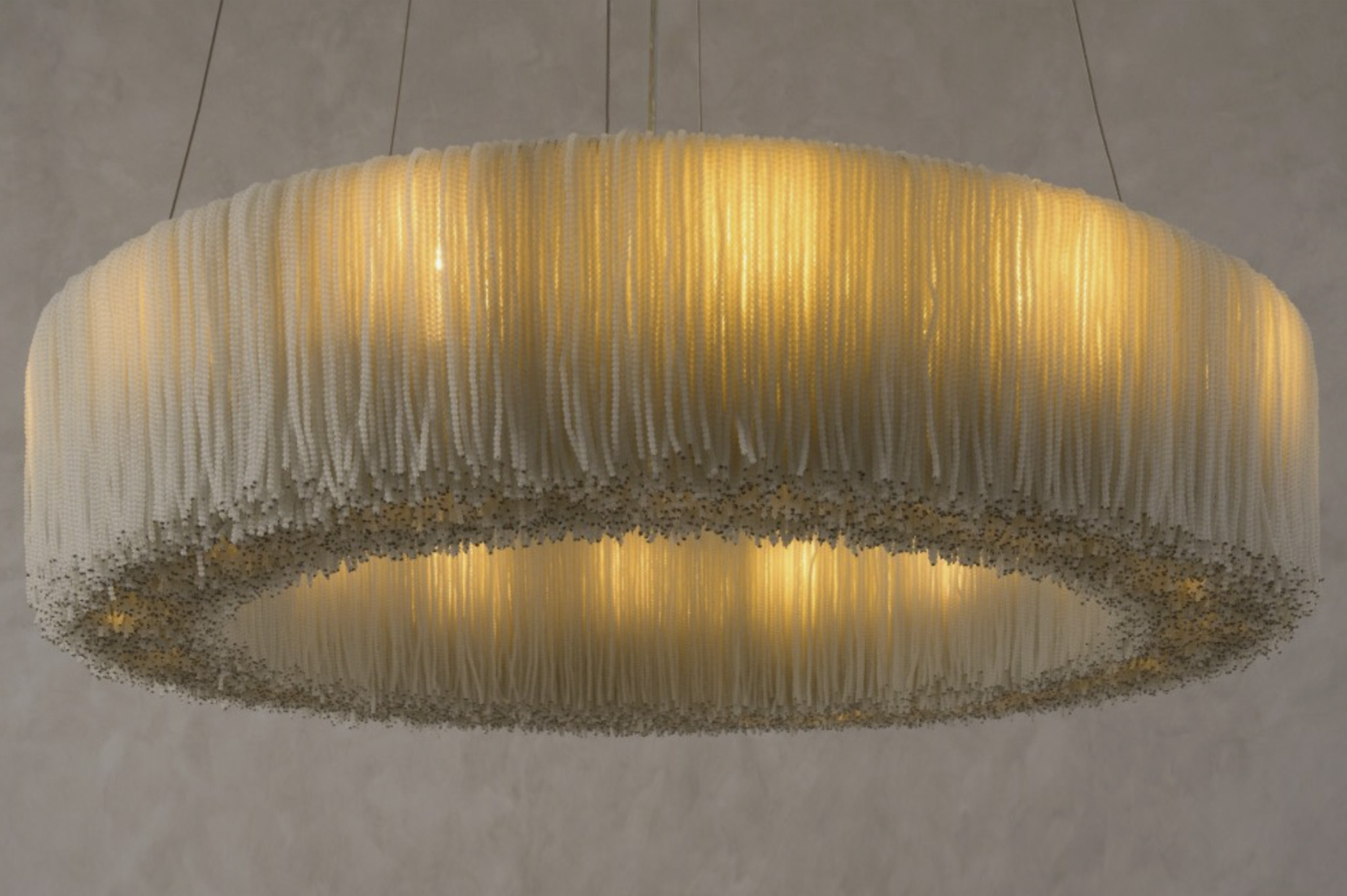 Mirage takes a different approach: it’s wide and low, designed to hover above a table like a luminous canopy. A structured ring shape is wrapped in delicate strands that create a soft “curtain” effect, so the light feels warmer, deeper, and more atmospheric. It’s especially beautiful in the evening, when the glow becomes layered and the texture starts to read like jewellery for the room.