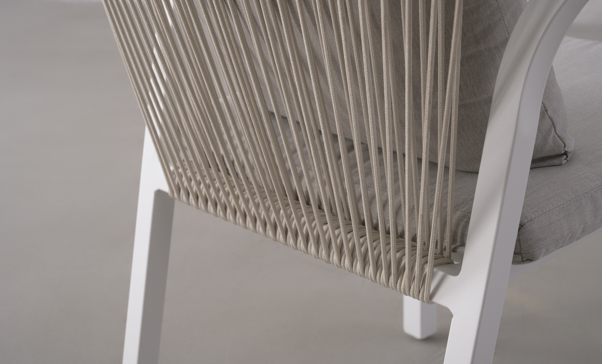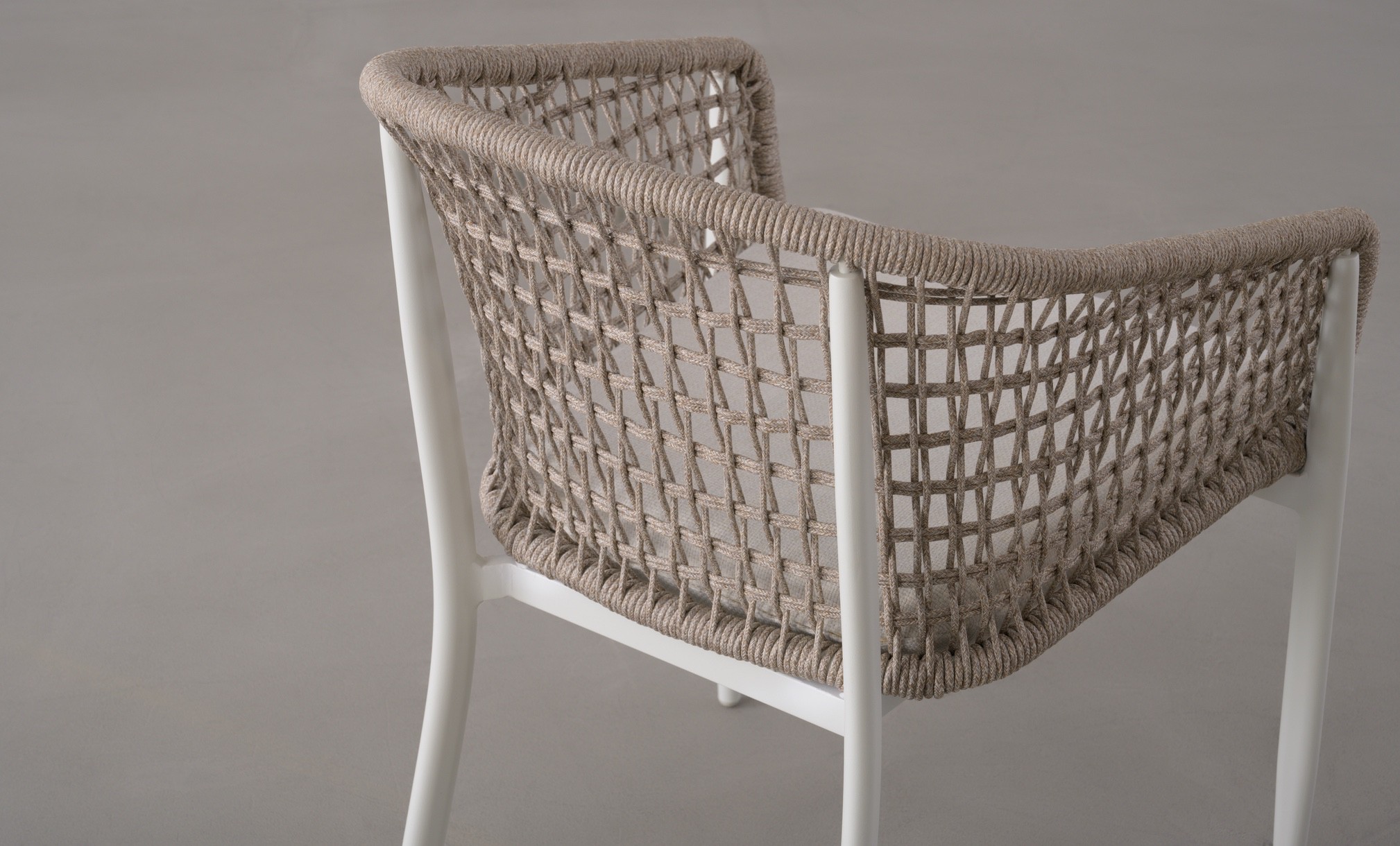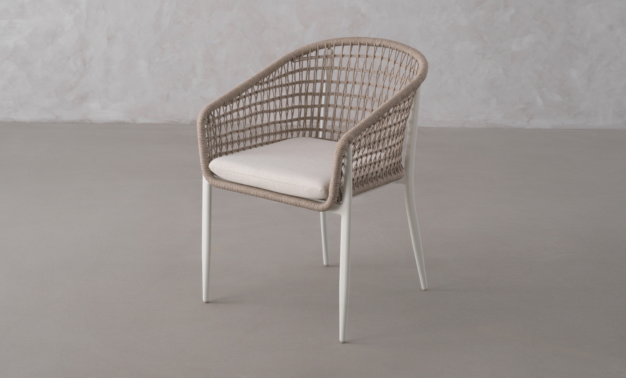 With its woven backrest and soft seat cushion, Mira brings a sense of texture and warmth to the outdoors. Around a large dining table, it creates a relaxed setting for long evenings together, while on a balcony, just one or two pieces are enough to set the tone for a cozy corner.