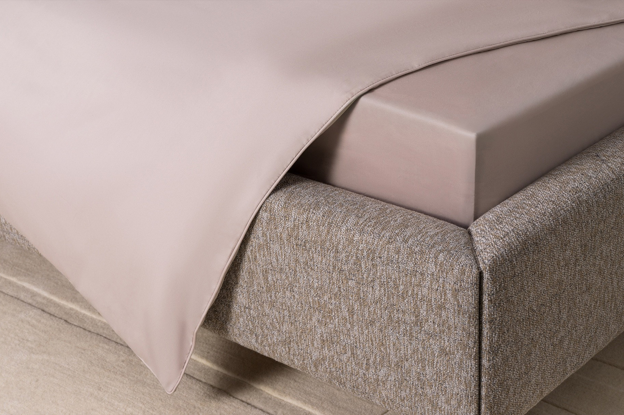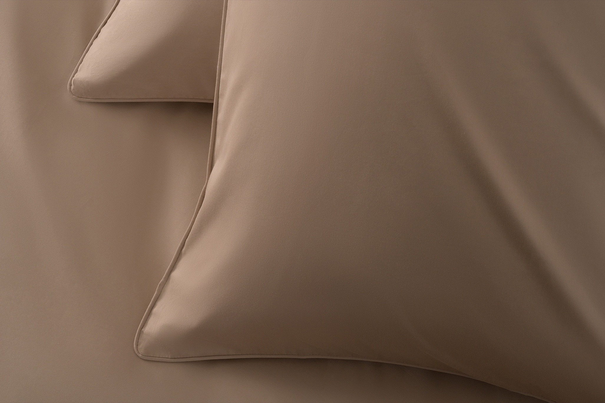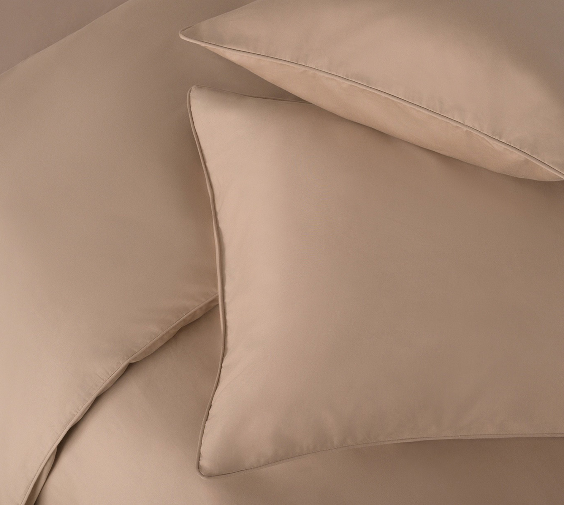 The warmest and most versatile of the four. A sandy camel with a golden undertone that shifts depending on the light – cooler in the morning, richer in the evening. The colour that asks the least of a room and gives the most back. It also combines most naturally with the other three: a Plum Kitten sheet under a Plaza Taupe duvet, or Mood Indigo pillowcases against a Plaza Taupe ground.
