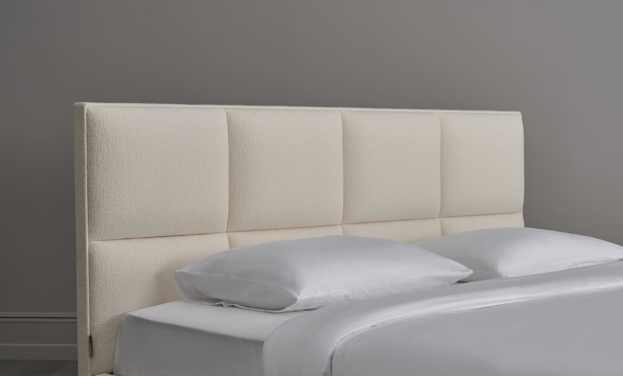 The Quadra Bed takes the same geometric idea further, emphasising the vertical rhythm of upholstered panels in the headboard. The larger proportions give the bed a more architectural presence, allowing it to anchor the bedroom visually while maintaining a calm and balanced aesthetic.