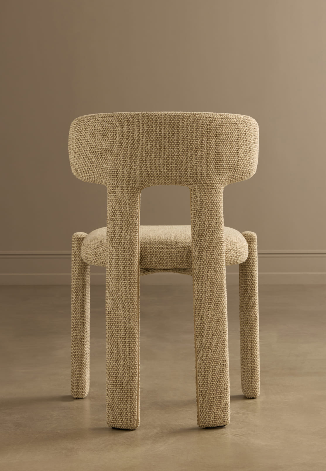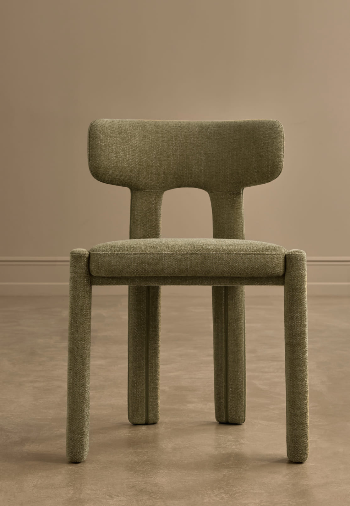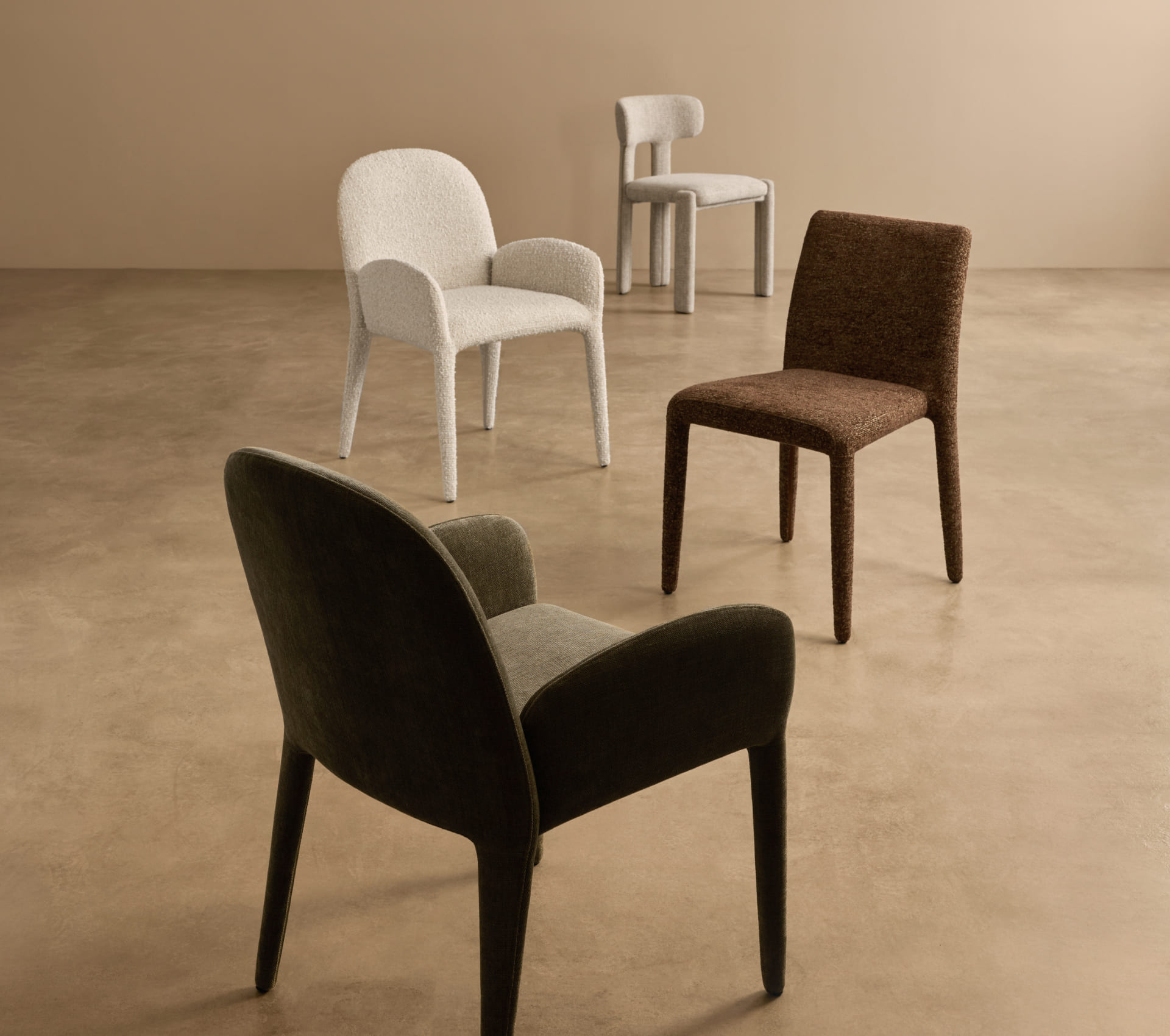 Pierce revisits a familiar chair profile through the lens of contemporary comfort. The character shifts notably across three upholstery tones – a melange chocolate-brown, a soft cream and a saturated olive – demonstrating how colour can recalibrate the presence of a well-known silhouette.
