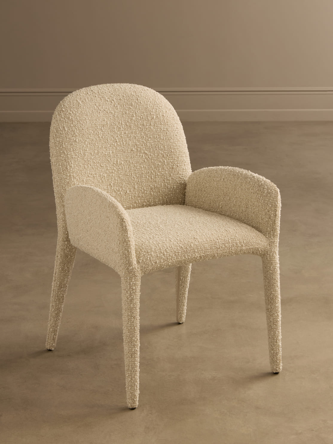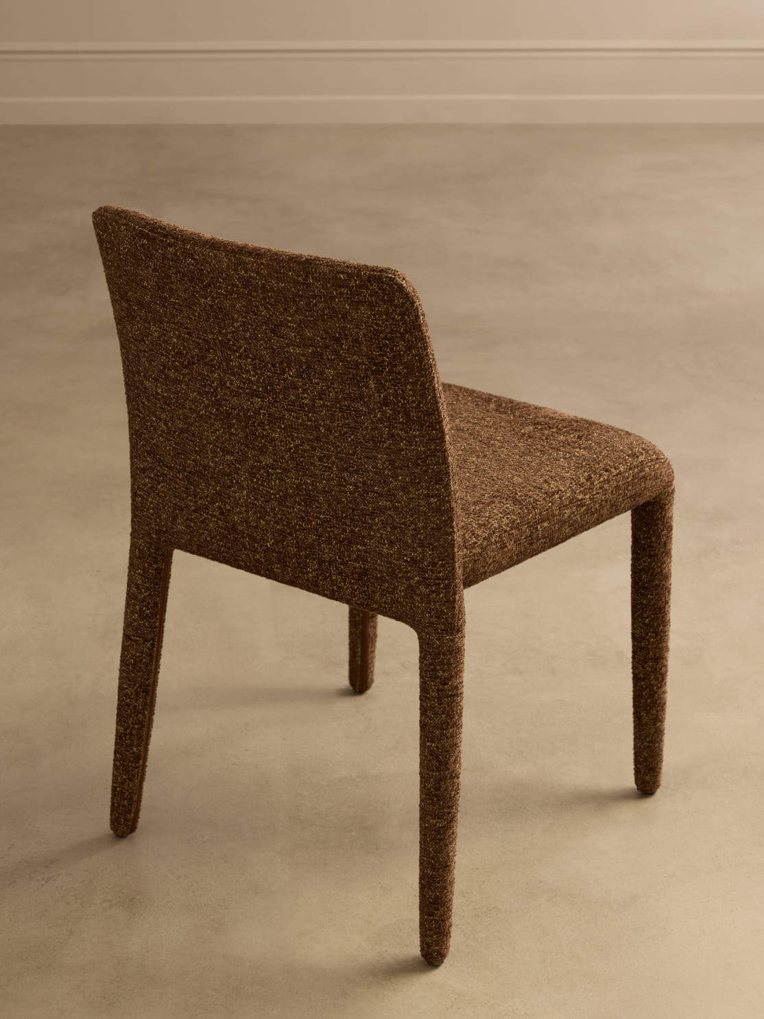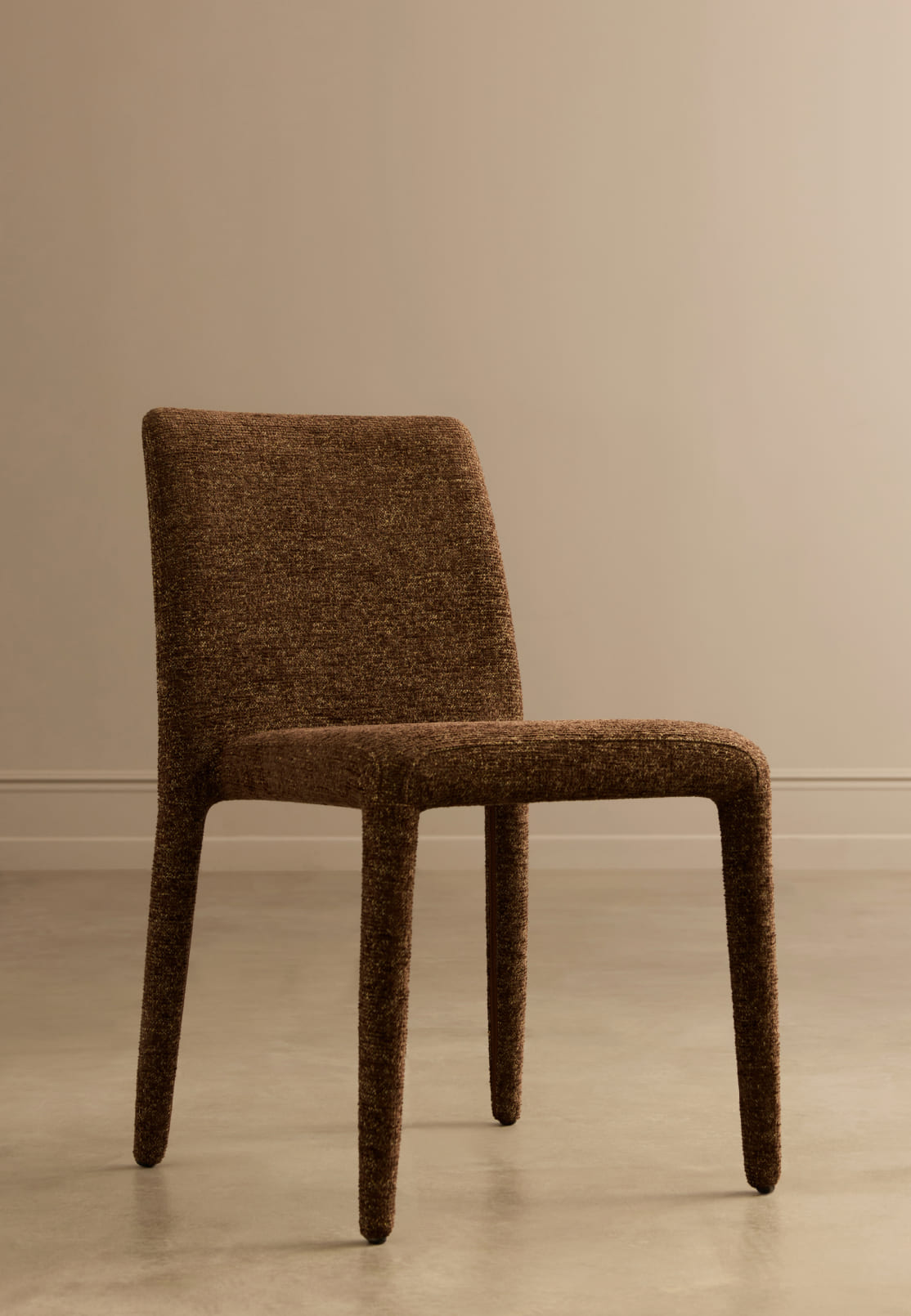 Pierce revisits a familiar chair profile through the lens of contemporary comfort. The character shifts notably across three upholstery tones – a melange chocolate-brown, a soft cream and a saturated olive – demonstrating how colour can recalibrate the presence of a well-known silhouette.