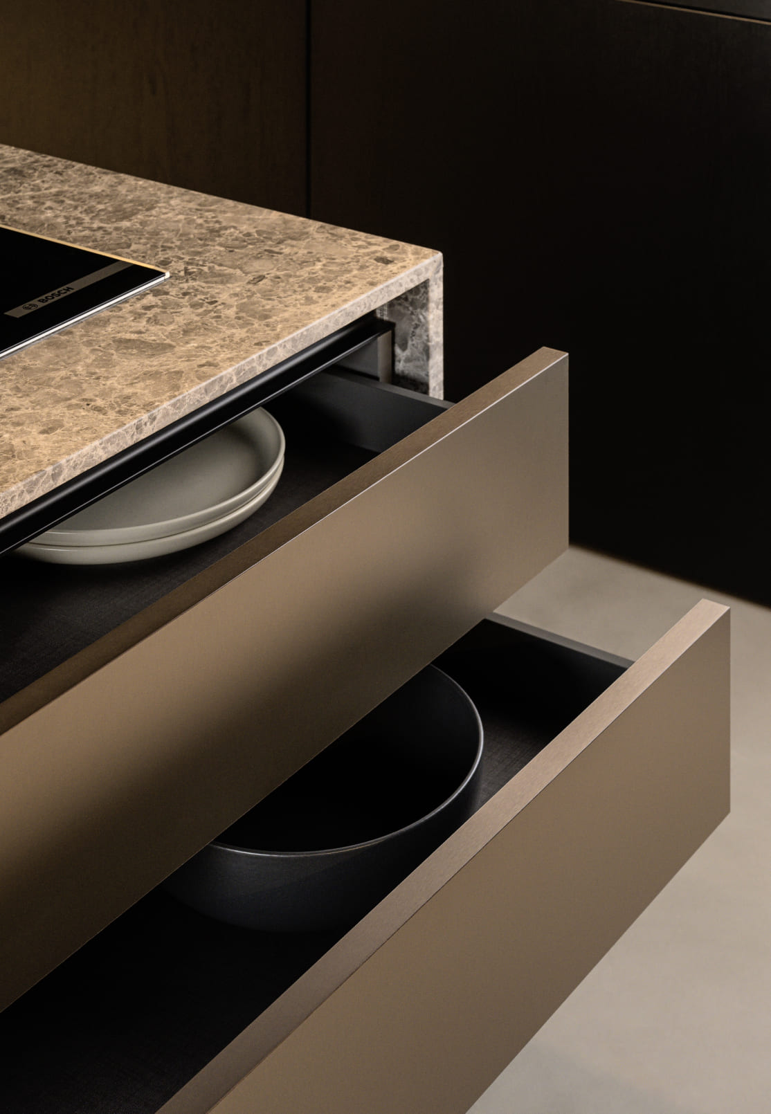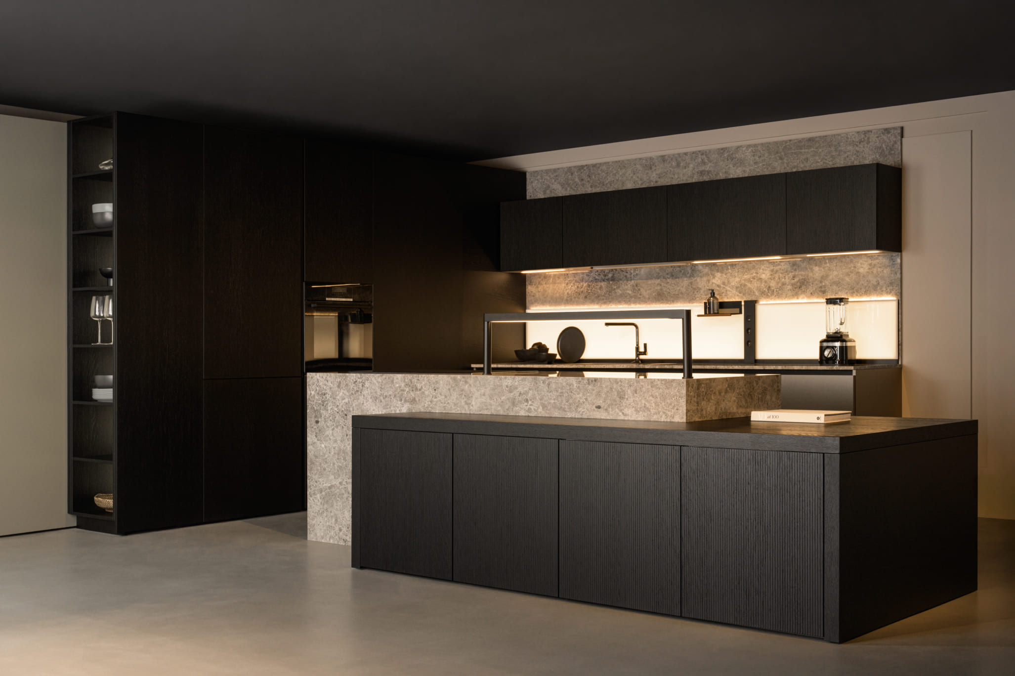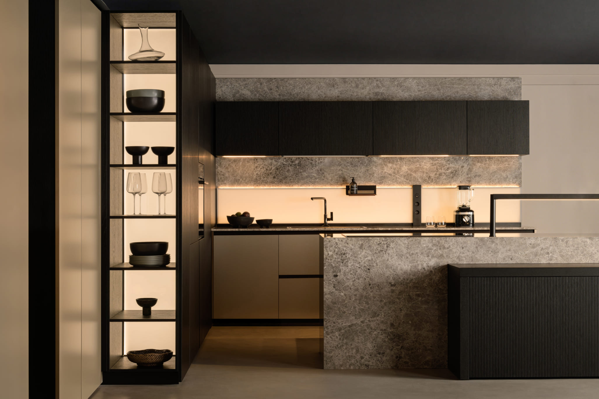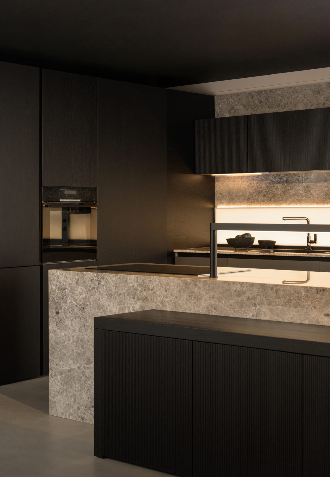 Every detail is specified for quality. All fronts are 22mm thick, including the fluted doors in treated veneer. The cabinet structure is engineered from high-density board by leading Italian manufacturers. Flawless, silent operation is ensured by premium hardware – hinges and drawer runners sourced from Italy and Germany.