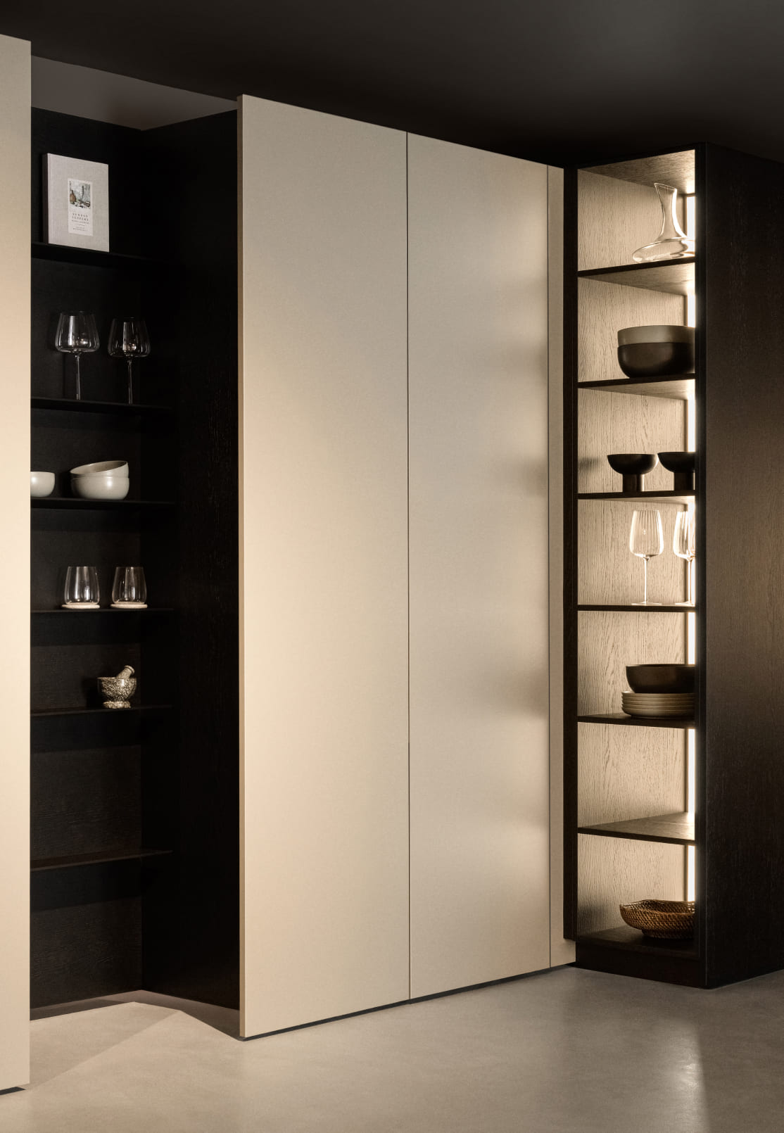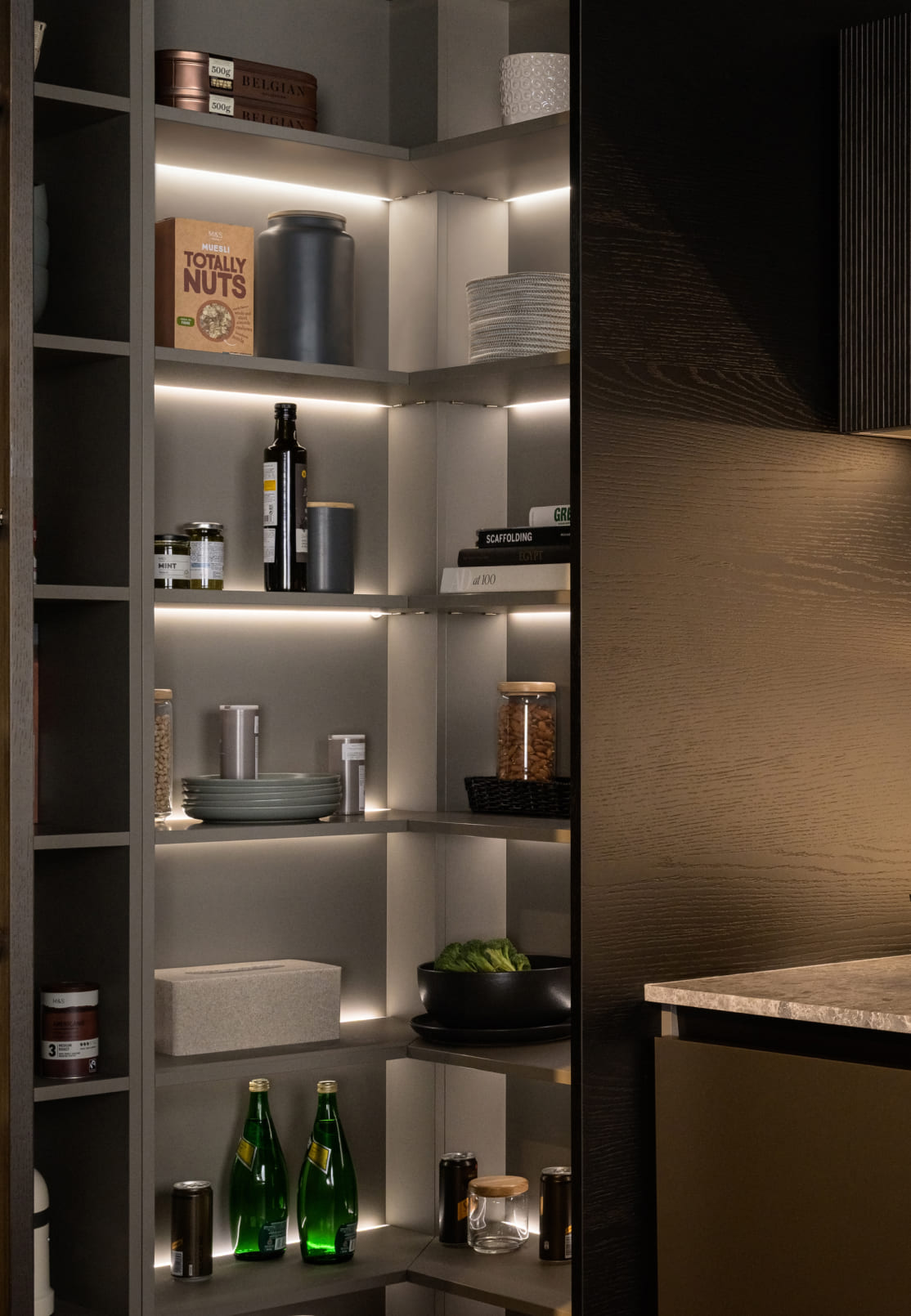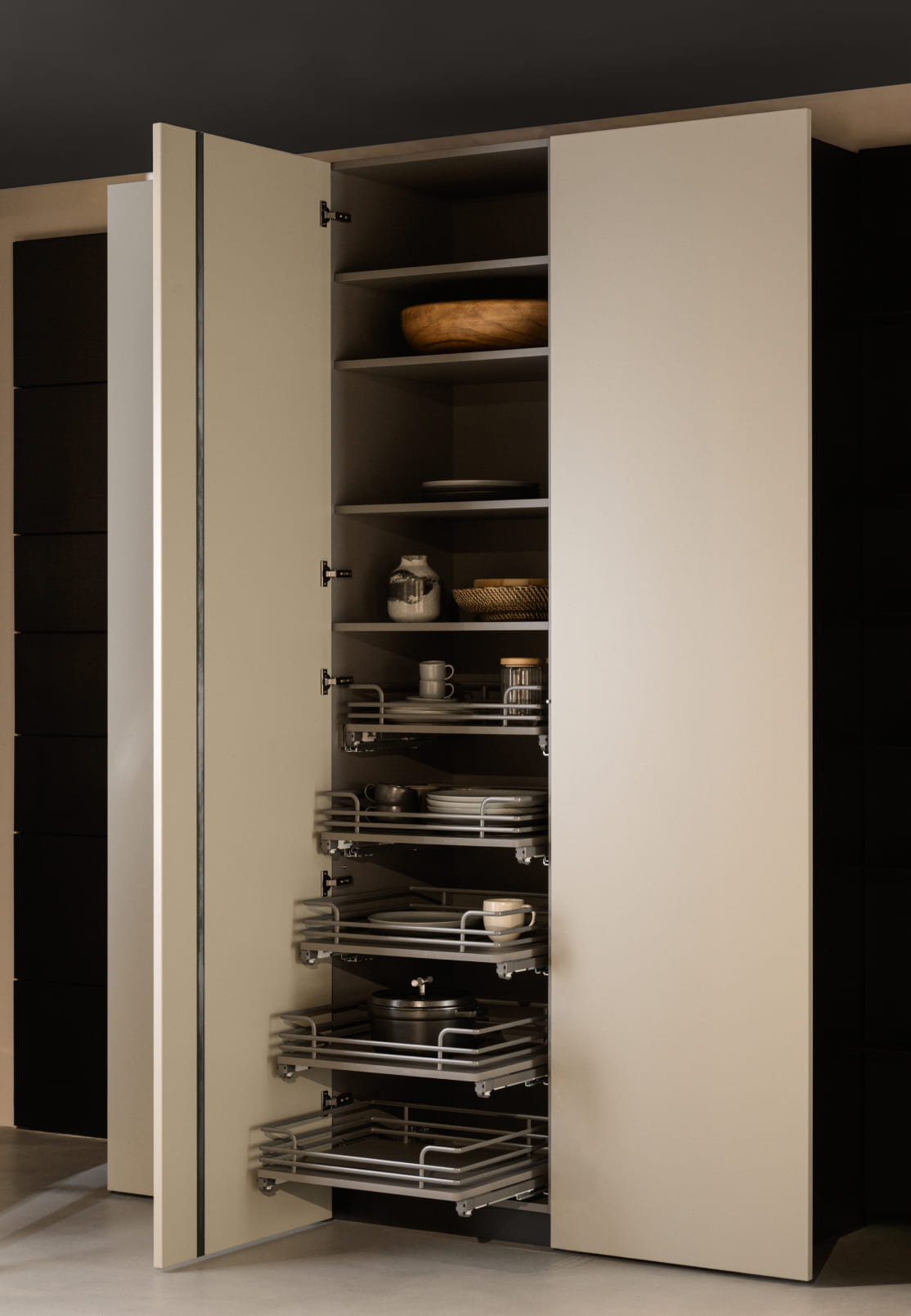 The Tall Pull-Out Pantry Storage System allows entire work zones to vanish from sight. For optimising awkward corners, the Project A module offers exceptional versatility – configure it as a pull-out pantry with shelves or deep drawers or straightforward storage. It functions as a full-height door, opening smoothly inwards on specialised hinges.