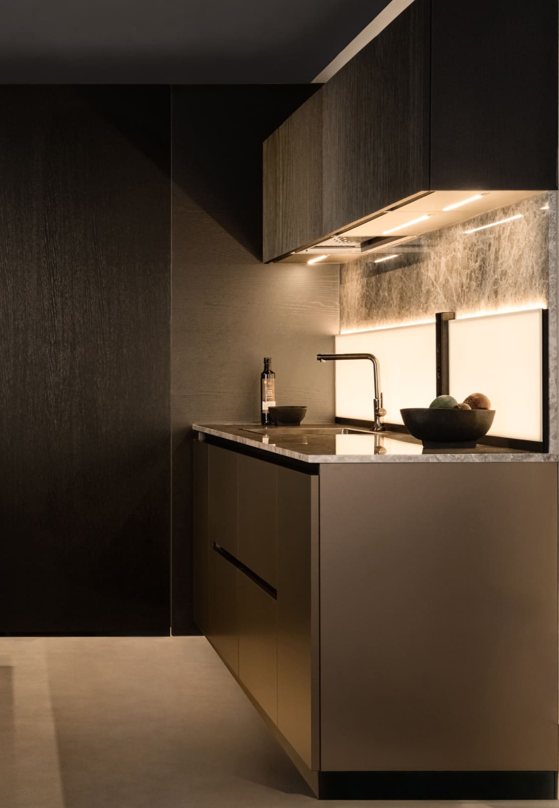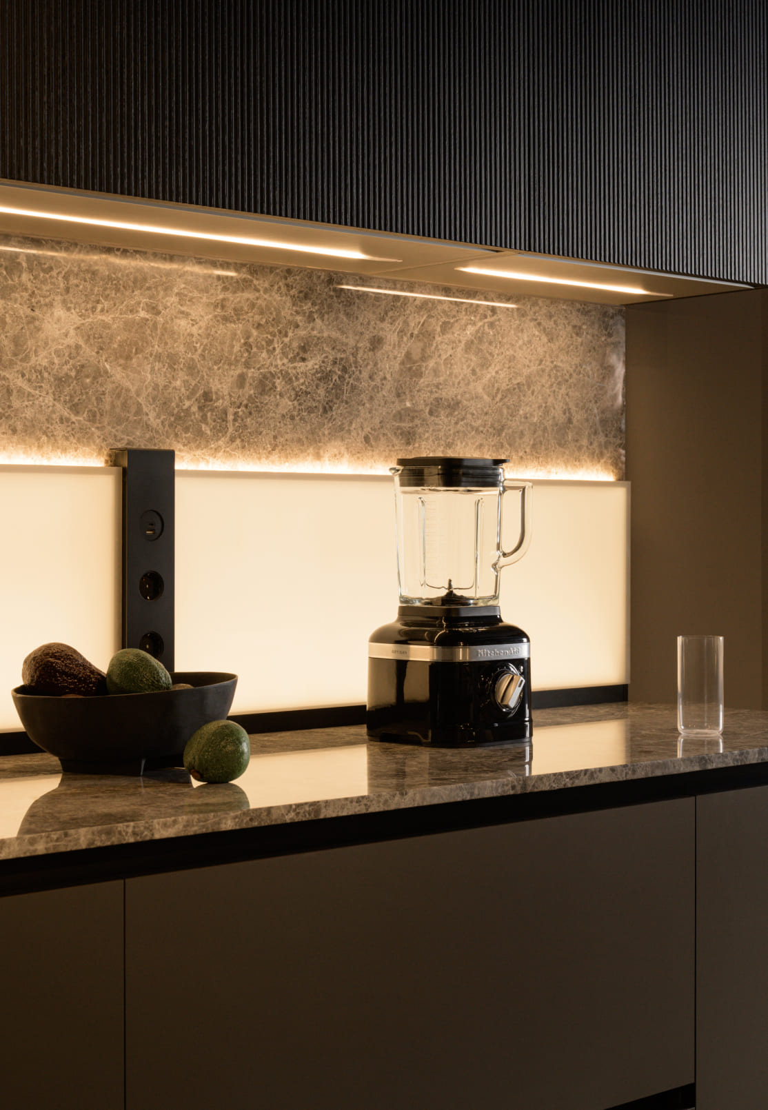 The lighting scheme has been carefully considered. A blend of linear and spot lighting provides perfect task illumination, revealing the depth of textures and transforming this three-metre functional zone into a space with its own distinctive atmosphere. The functional layout supports seamless use, with discreet, built-in sockets ensuring appliances for your daily rituals are always ready without the clutter of trailing cables.