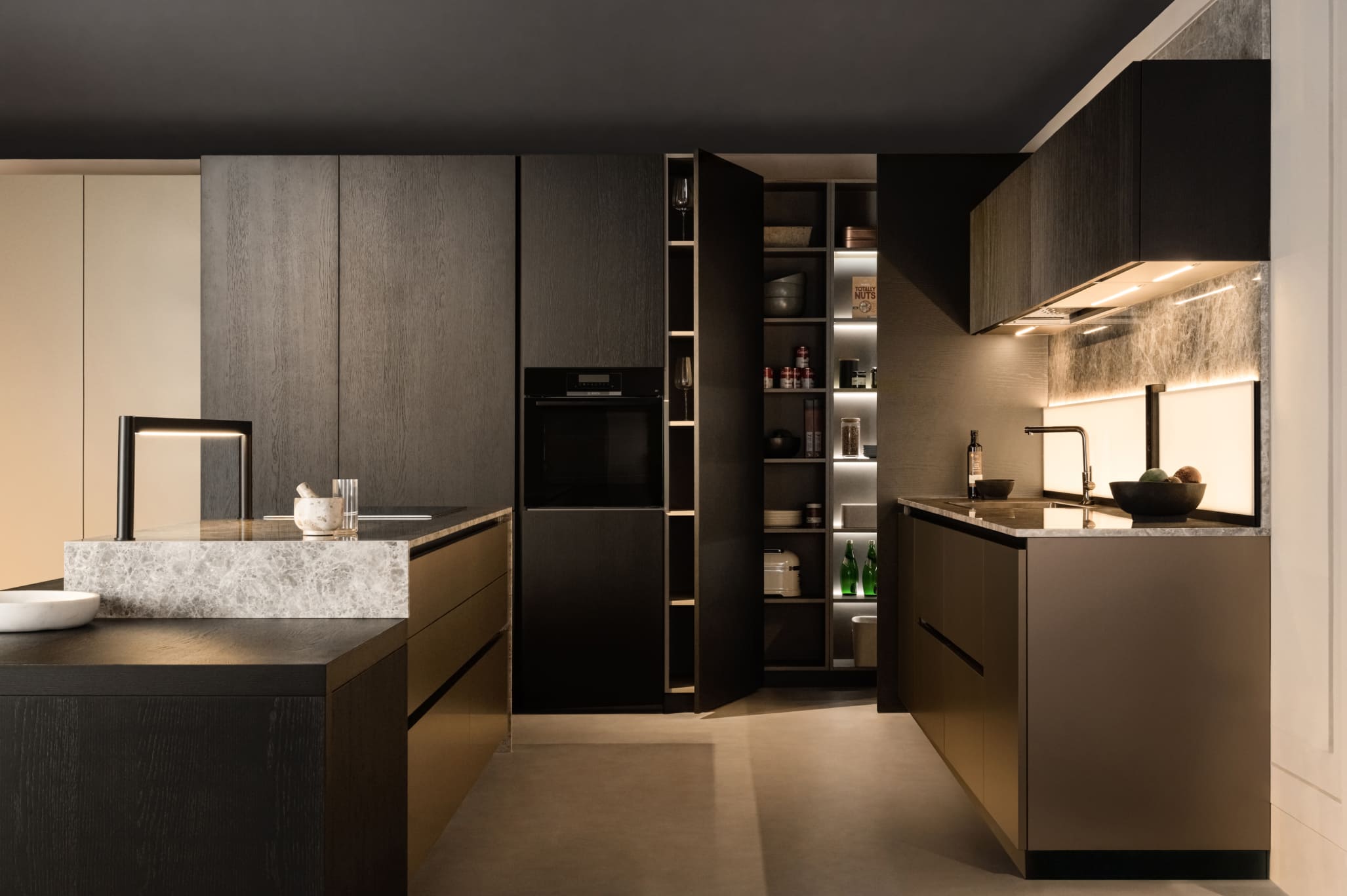 The wall units, finished in Fiammato Nero and matt lacquer, are intentionally designed not to reach the ceiling. This deliberate styling trick lightens the visual weight of the composition, creating an airy feel and preserving a sense of spaciousness even in a detail-rich kitchen. Their compact yet capacious forms ensure easy access to contents.