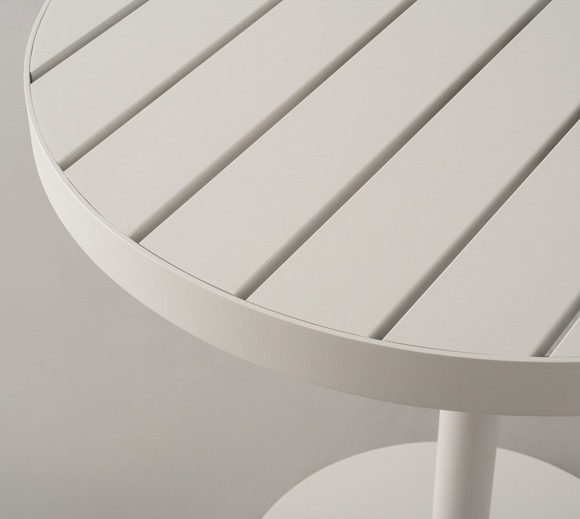 The Bistro Table is 80 cm in diameter: enough for two cups of coffee, a shared breakfast, or a laptop and a glass of water. It is the kind of table that works equally well on a city balcony, in a courtyard corner, or on the front terrace of a café. A table this compact allows tighter spacing on a restaurant veranda without the setup feeling crowded; on a residential terrace where space is limited, it offers a place to sit and eat without dominating the floor.