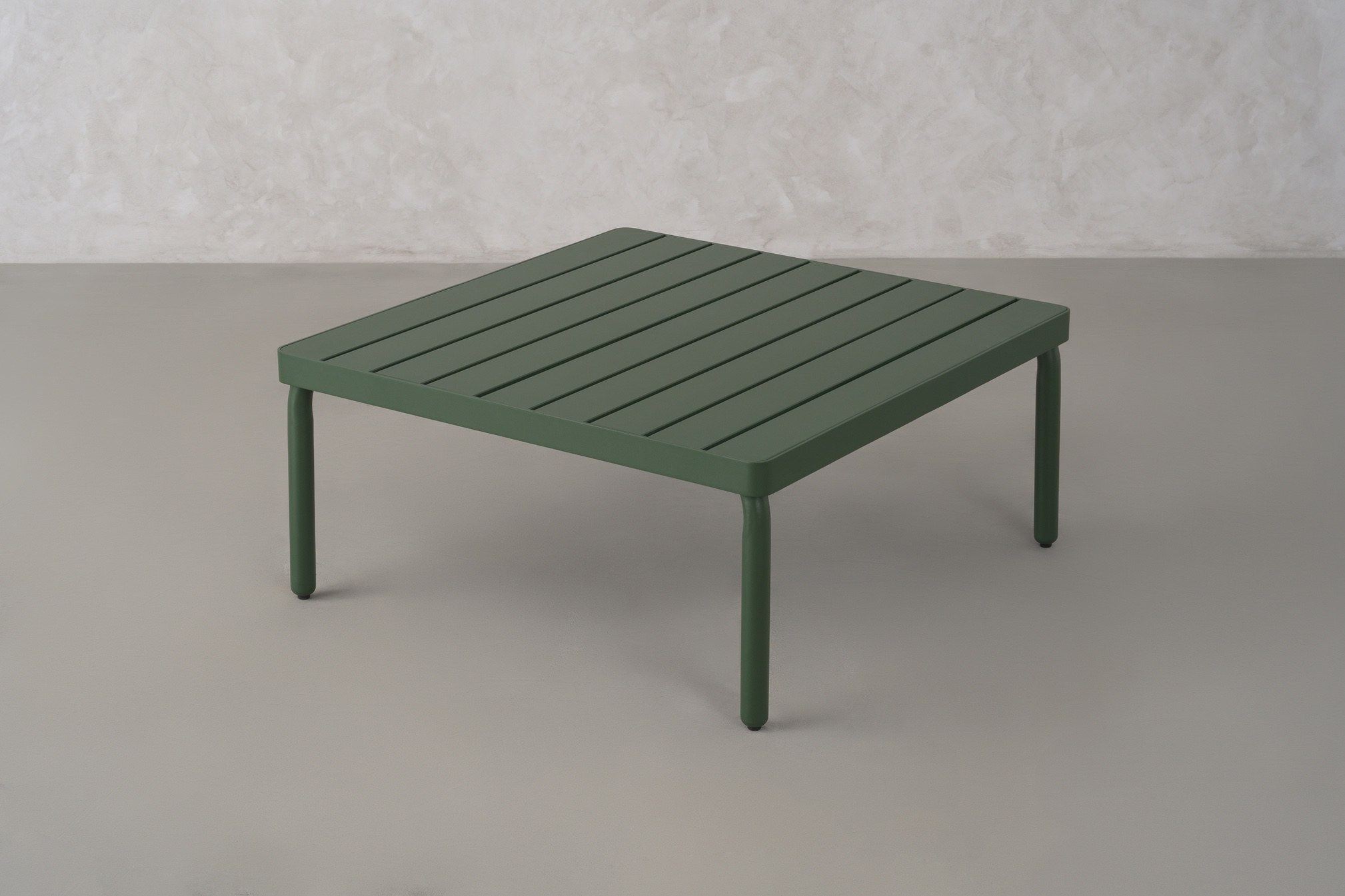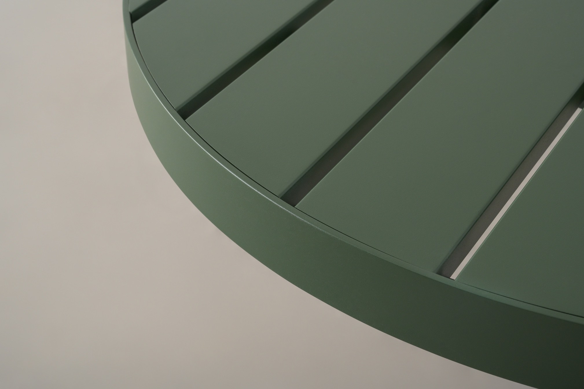 A Bistro Table, a Square Coffee Table, and a Round Dining Table: same powder-coated aluminium, same two colourways – the original deep green and Haze Sandy. Smaller in scale, identical in construction.