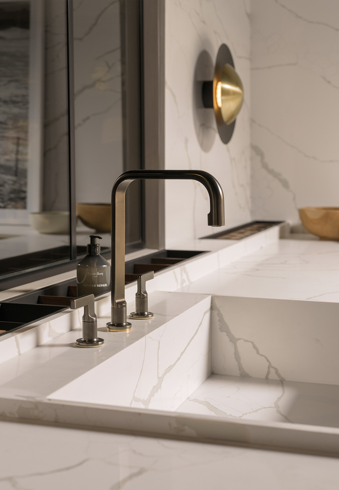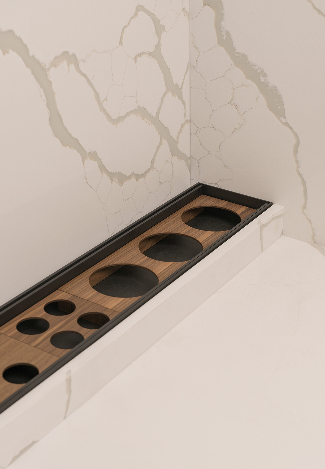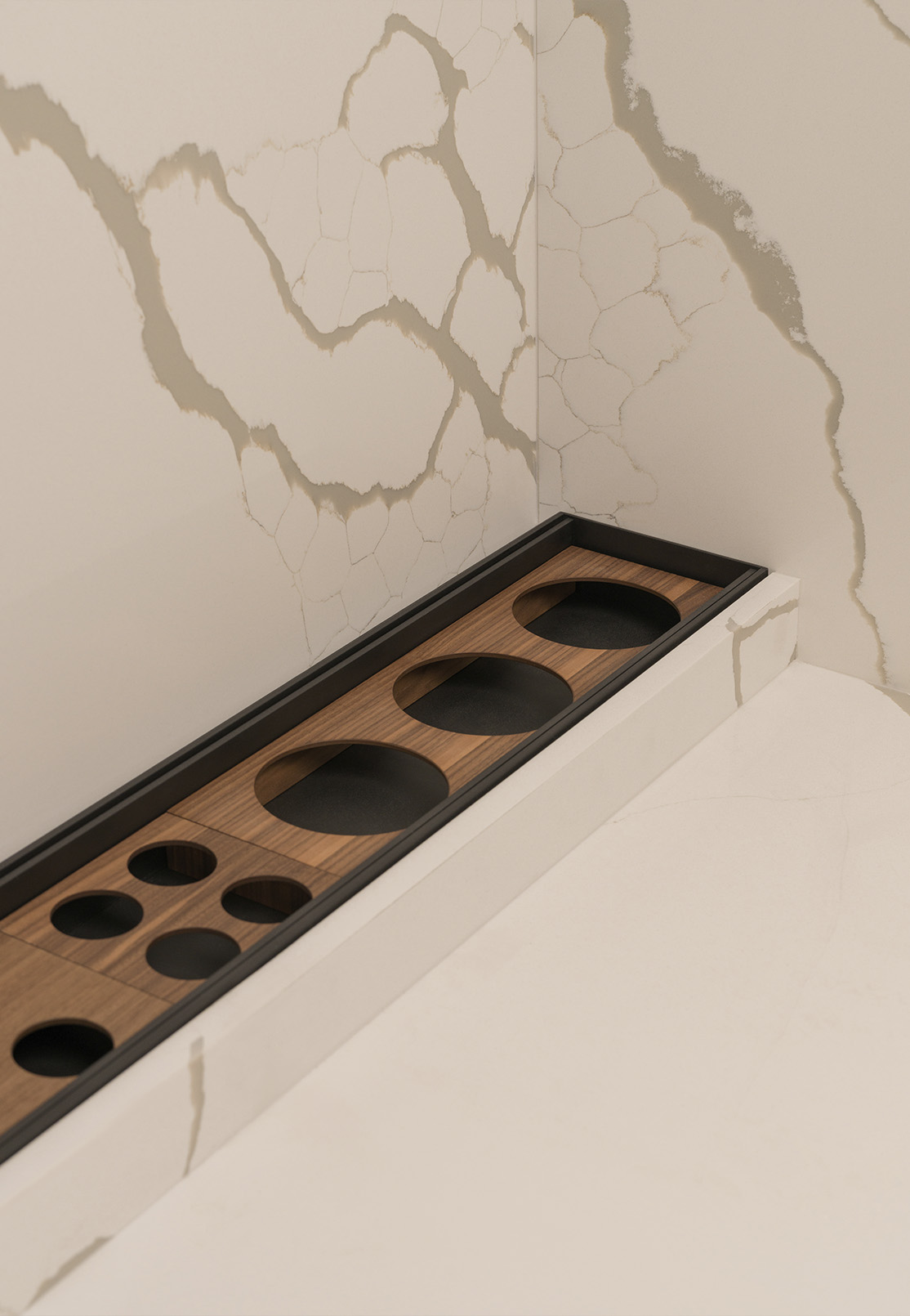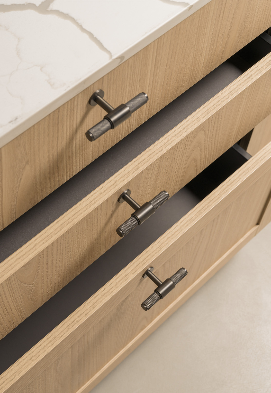 Storage follows the same quiet logic. Drawers extend fully, revealing everything at once. Smaller items remain organised and within reach, allowing order to sustain itself as part of daily routine.