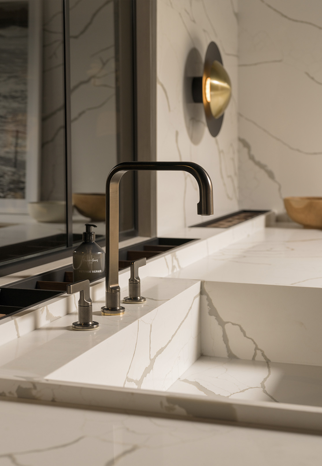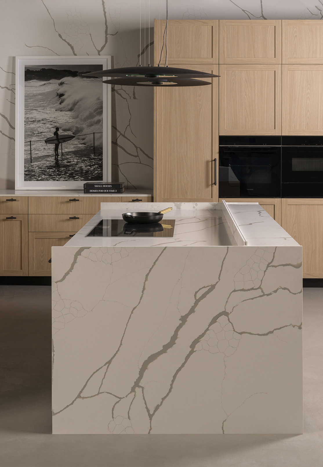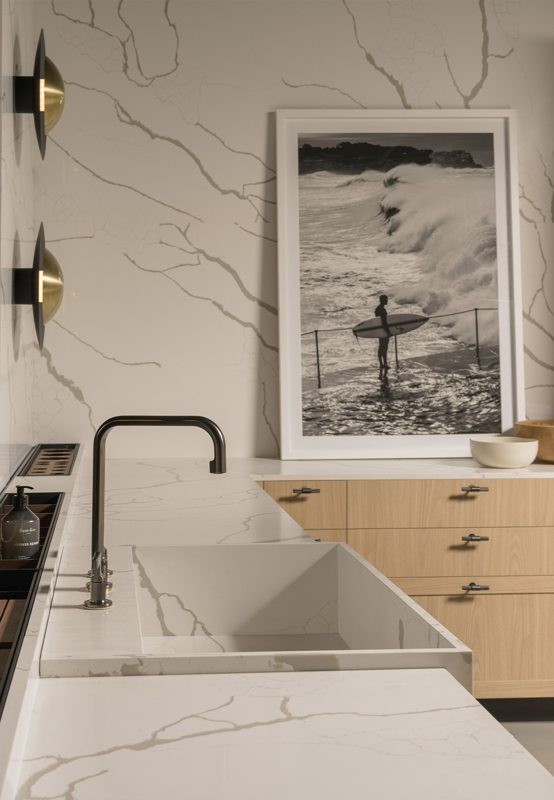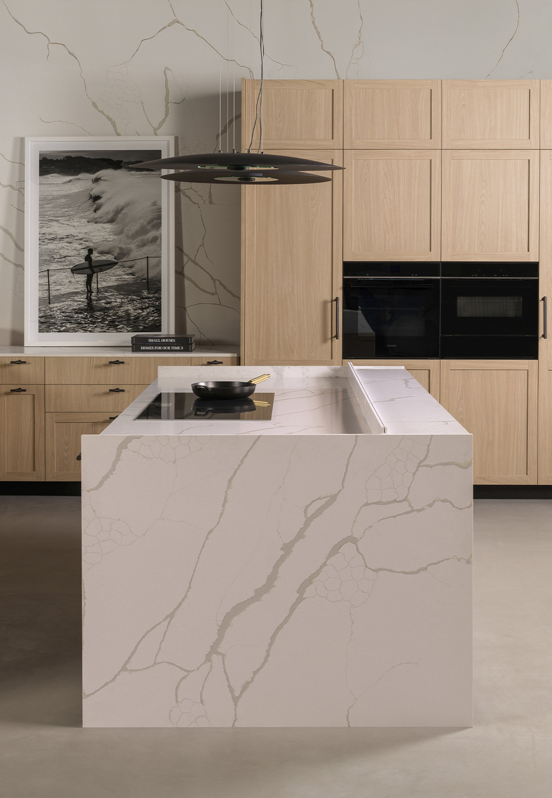 The island gathers activity without demanding it. Cooking remains open to the room, conversation continues alongside preparation, and seating finds its place at a distance that feels considered. Stone surfaces add depth through their natural patterning, while integrated elements — from the sink to internal organisers — maintain a continuous, uninterrupted plane.