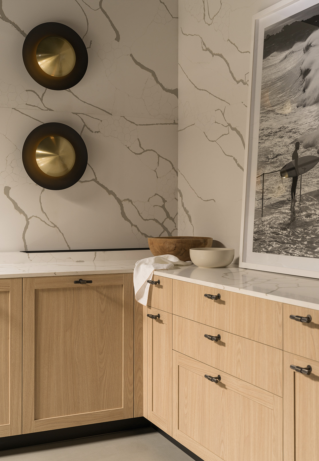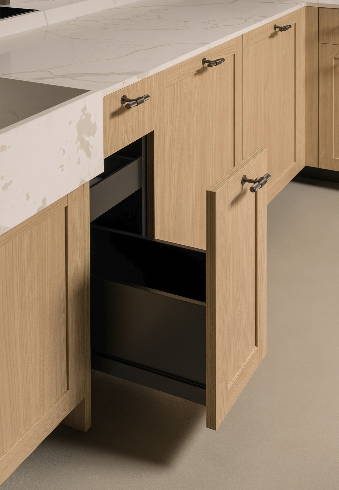 Closer to the floor, the recessed matte black toe kick introduces a subtle shadow that lifts the composition visually. Standing at the counter feels comfortable and grounded, even during longer moments of preparation. The balance between lightness and stability becomes apparent through use, not observation.