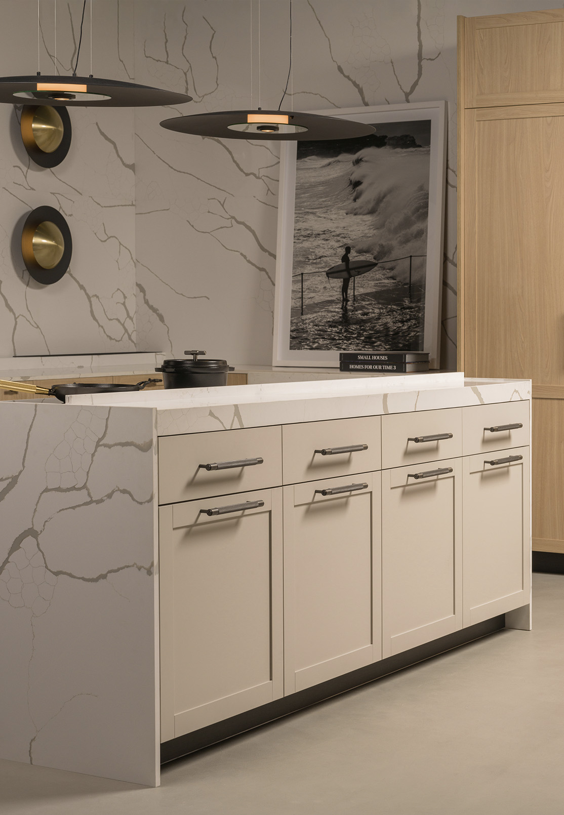 Several material groups and dozens of colour options allow surfaces to respond to both space and light. Subtle shifts in tone help articulate volumes, allowing elements such as the island to appear lighter within the overall composition. Contrast emerges naturally, through texture, depth and shadow rather than through emphasis.