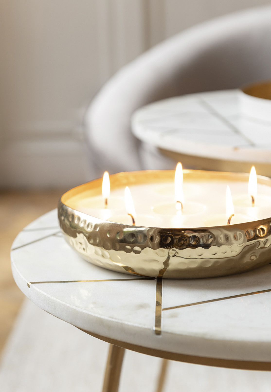 From sculptural pillar holders to gold-rimmed hurricane glass and snow-globe-inspired cloches, the candle collection is all about atmosphere. Choose hammered metal bowls for a warm glow, tall white candles for elegance, or glass domes to soften the flicker — perfect for evenings when the house feels hushed and still.
