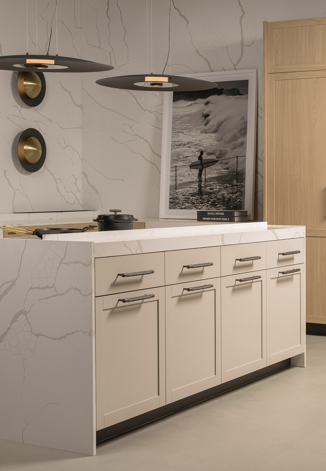 Several material groups and dozens of colour options allow surfaces to respond to both space and light. Subtle shifts in tone help articulate volumes, allowing elements such as the island to appear lighter within the overall composition. Contrast emerges naturally, through texture, depth and shadow rather than through emphasis.